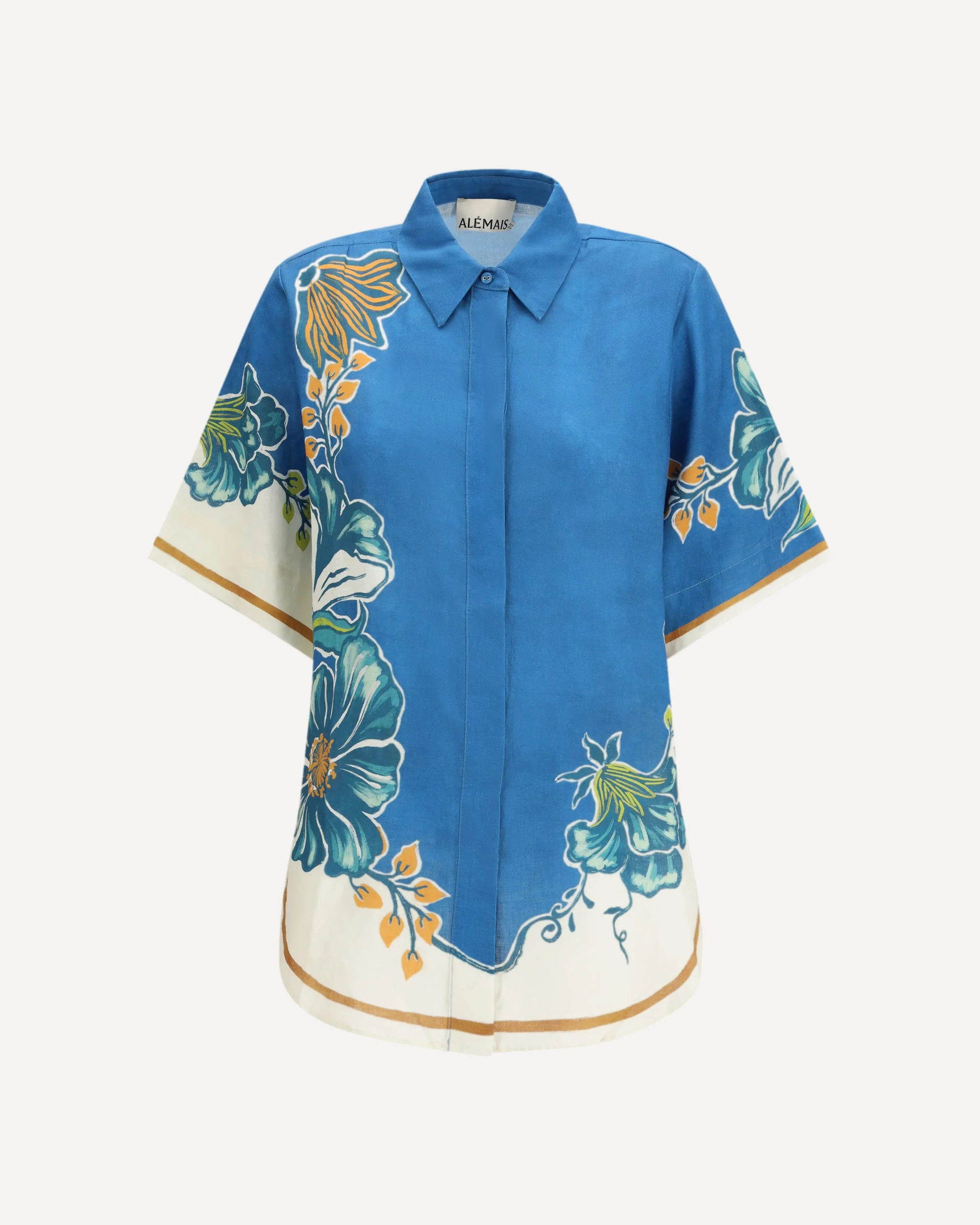 The Luda Shirt by Alemais features a relaxed shirt silhouette, designed for an effortless yet refined look. It is detailed with a pointed collar and stand, a concealed placket with self-covered buttons, and a clean, minimal line that highlights the garment’s print and craftsmanship. DETAILS - Sku: 6394T_BLUE - Season: SS26 - Fit: Regular - Composition: GENERAL 100% Linen - MADE IN CHINA