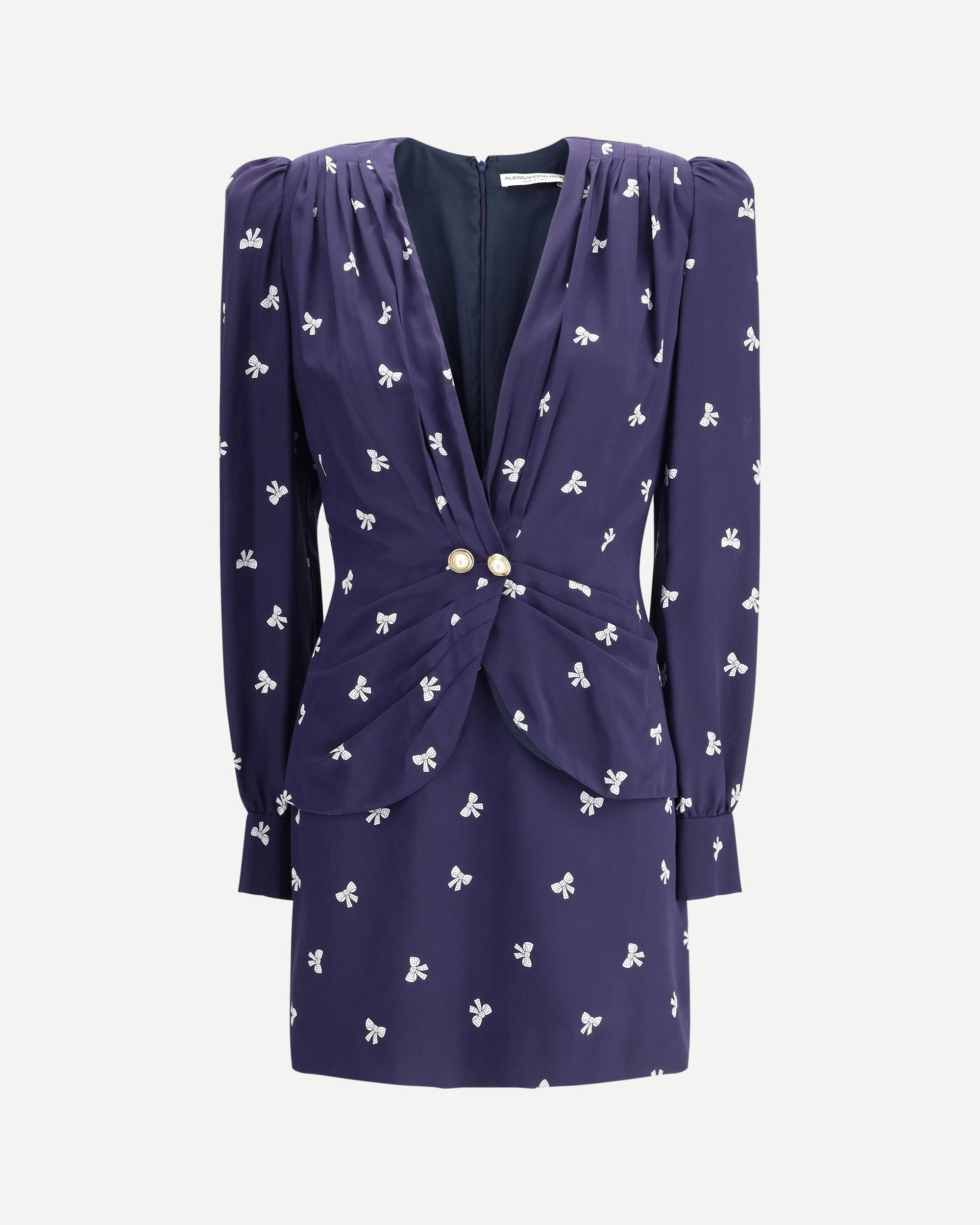 The Bow Patterned Short Dress by Alessandra Rich combines a playful design with refined details. Made with an all-over print of bows, it features a wide front neckline and padded shoulders that elegantly define the silhouette. Two jeweled buttons embellish the front, while the back zipper closure ensures a perfect fit. A feminine and contemporary piece, perfect for a sophisticated and characterful look. DETAILS - Sku: FABX4229_1844 - Season: AW25 - Fit: Regular - Composition: GENERAL 100% Silk - MADE IN ITALY