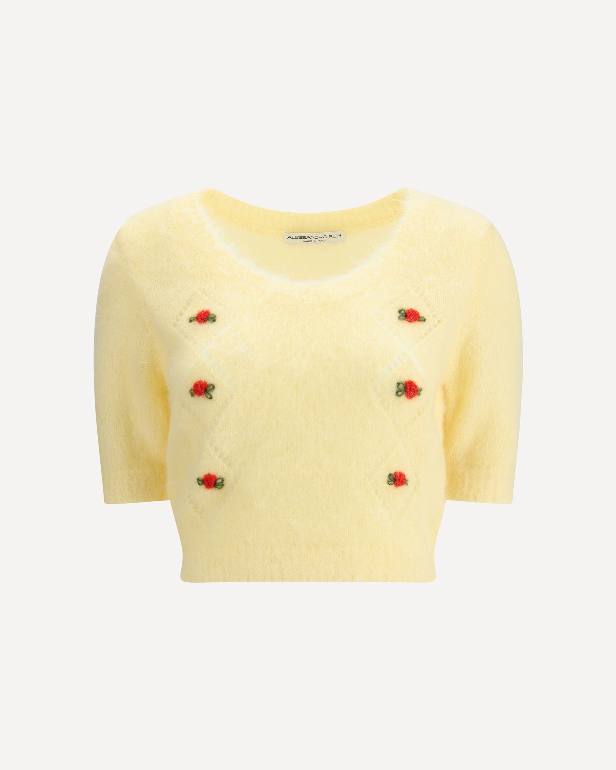 Alessandra Rich's short sleeve mohair Sweater is a delicate and feminine piece perfect for adding a romantic touch to your wardrobe. Featuring a round neckline and ribbed hemline, it has fine openwork details and embroidered flowers on the front, enhancing its sophisticated aesthetic. DETAILS - Sku: FABX4186_9088 - Season: AW25 - Fit: Regular - Composition: GENERAL 50% Mohair 32% Polyester 18% Wool - MADE IN ITALY