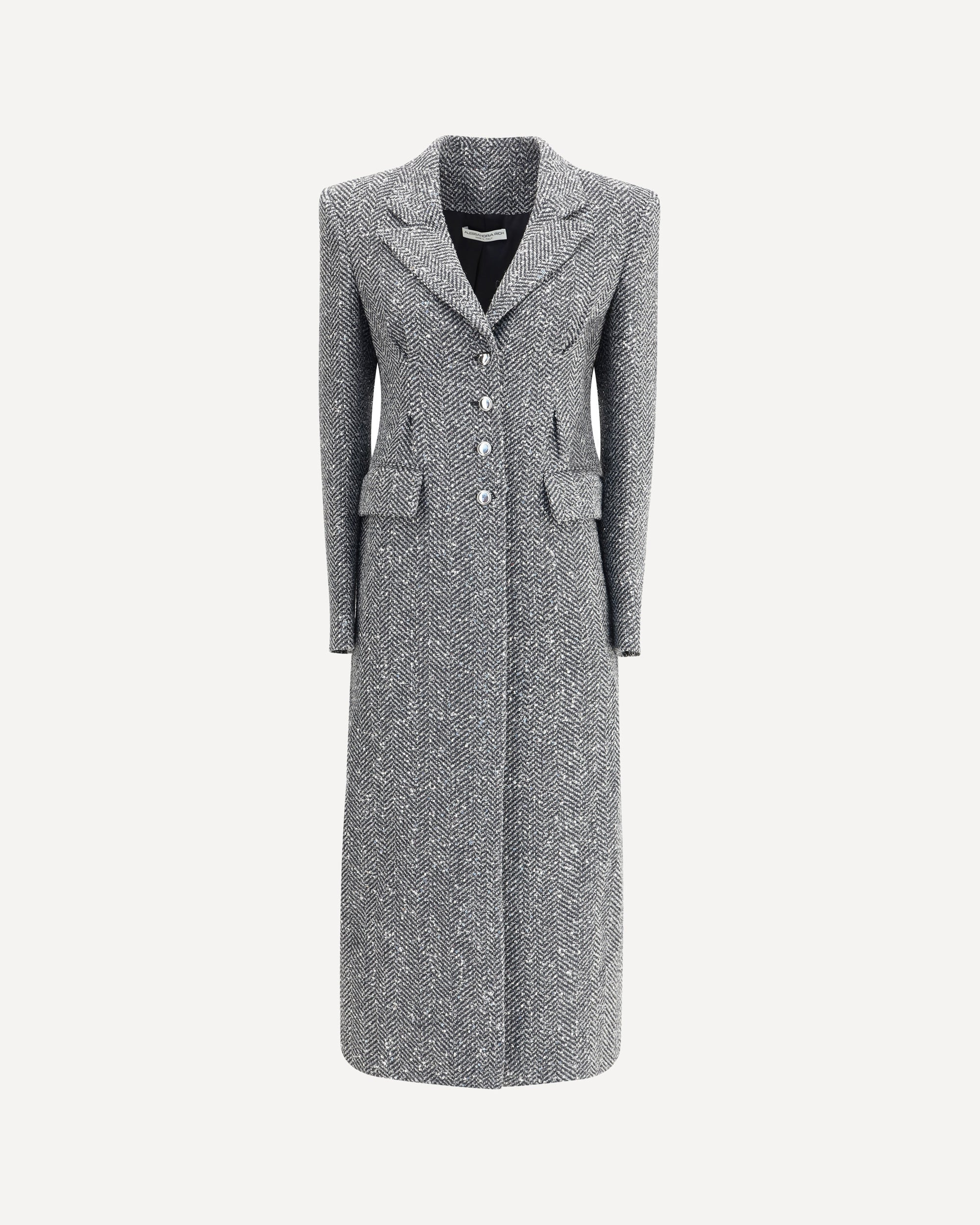 Alessandra Rich's tweed long Coat stands out for its elegant and timeless style. Featuring peaked lapels and a front closure with jeweled buttons, it features two flap welt side pockets, perfect for combining functionality and sophistication. DETAILS - Sku: FABX4158_1665 - Season: AW25 - Fit: Regular - Composition: GENERAL 90% Fleece Wool 10% Polyamide - MADE IN ITALY