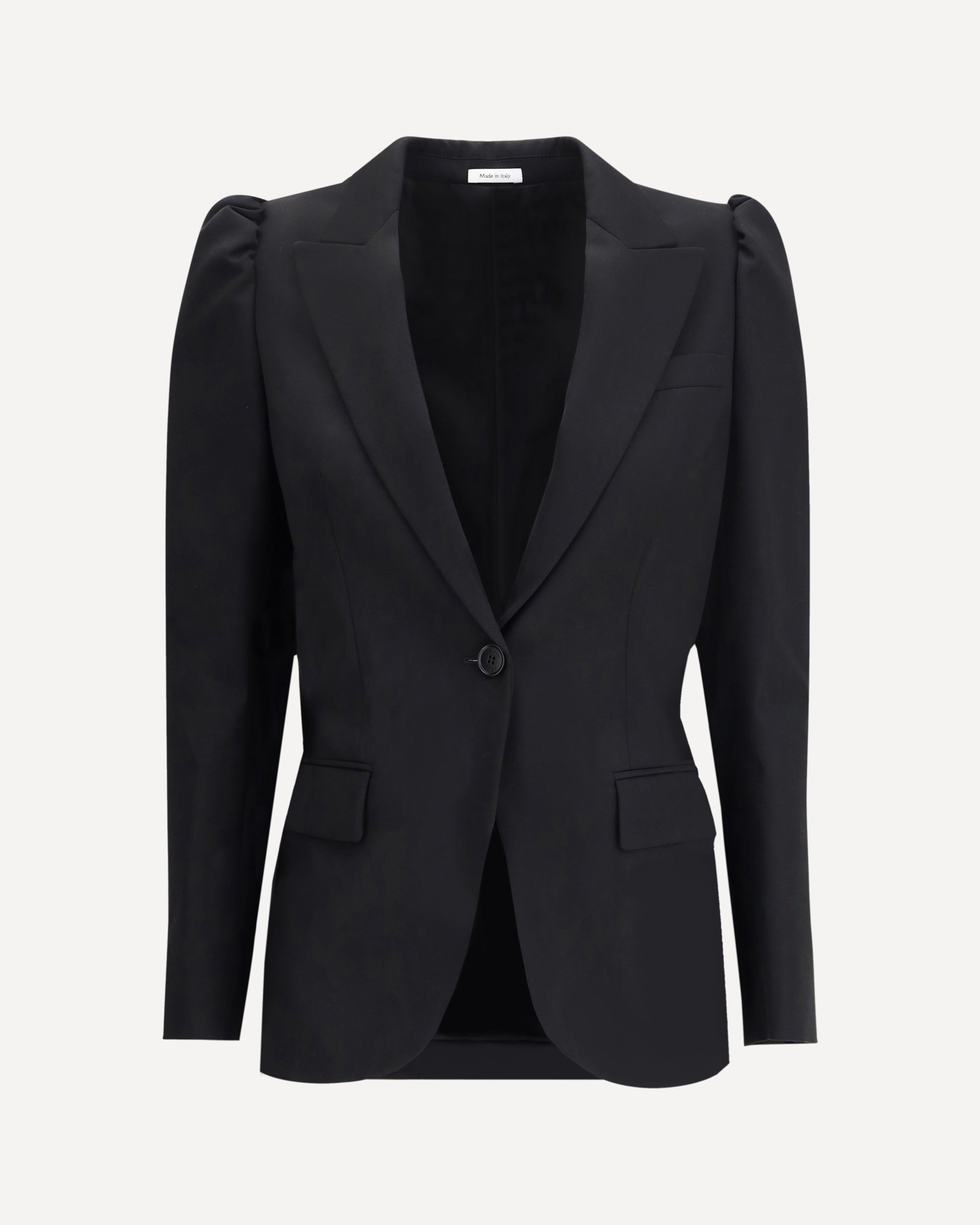 The Black single-breasted Jacket by Alexander Mcqueen reimagines classic elegance with a contemporary twist. Traditional lapels, a chest pocket, and two flap side pockets create clean, sophisticated lines, while the single-button closure accentuates the sleek silhouette, making it perfect for modern, refined outfits DETAILS - Sku: 848491QJAAC_1000 - Season: AW25 - Fit: Regular - Composition: GENERAL 100% Wool - MADE IN ITALY