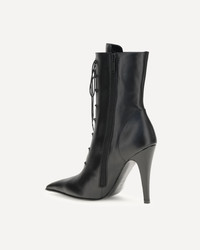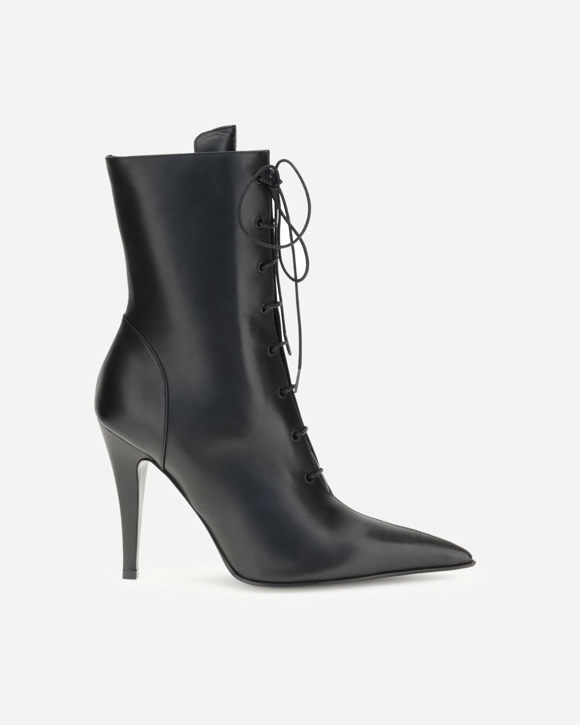 TheLeather Ankle Boots by McQueen combine boldness and refinement. The pointed toe elongates the silhouette, while the braided laces at the front add a distinctive artisanal detail. The side zip ensures easy wear, and the high heel provides elegance and femininity, making this model perfect for sophisticated, contemporary looks. The quality leather and meticulous finishing complete an iconic design, characteristic of McQueen’s style. DETAILS - Sku: 846018WHAEJ_1000 - Season: AW25 - Composition: GENERAL 100% Calf Leather Bos Taurus - MADE IN ITALY