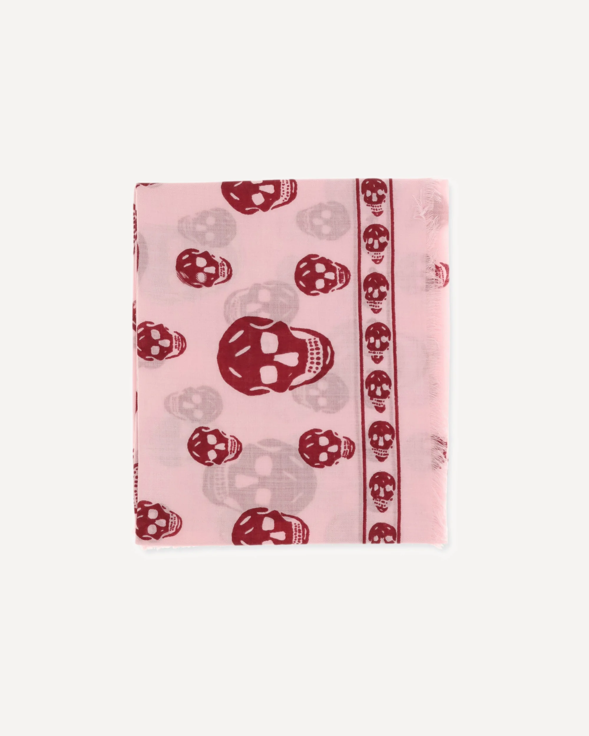 The Skull Foulard by McQueen is crafted from a silk and modal blend in black and dark grey, featuring an all-over Skull motif. The fringed edges are accented with Skull details and the McQueen logo, creating a distinctive, contemporary accessory. DETAILS - Sku: 8078893222Q_5972 - Season: SS26 - Dimension: 120x104 - Composition: GENERAL 85% Modal 15% Silk - MADE IN ITALY
