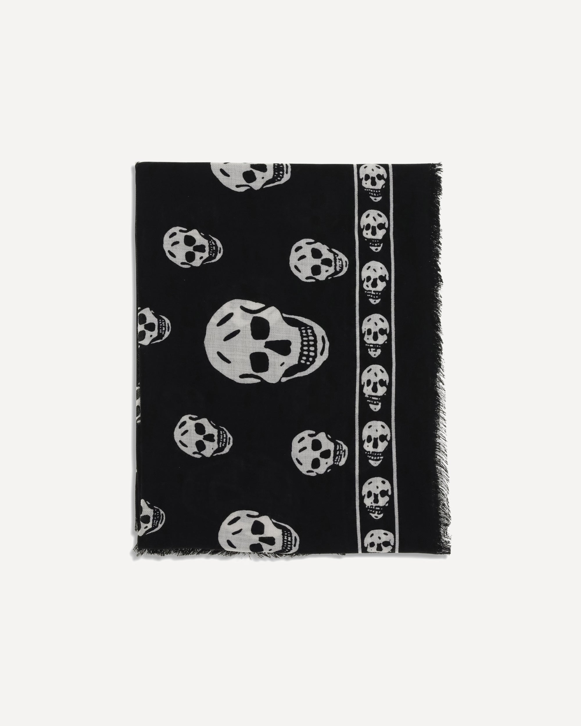 The Skull Foulard by McQueen is crafted from a silk and modal blend in black and dark grey, featuring an all-over Skull motif. The fringed edges are accented with Skull details and the McQueen logo, creating a distinctive, contemporary accessory. DETAILS - Sku: 8078893222Q_1078 - Season: AW25 - Dimension: 120x120 - Composition: GENERAL 85% Modal 15% Silk - MADE IN ITALY