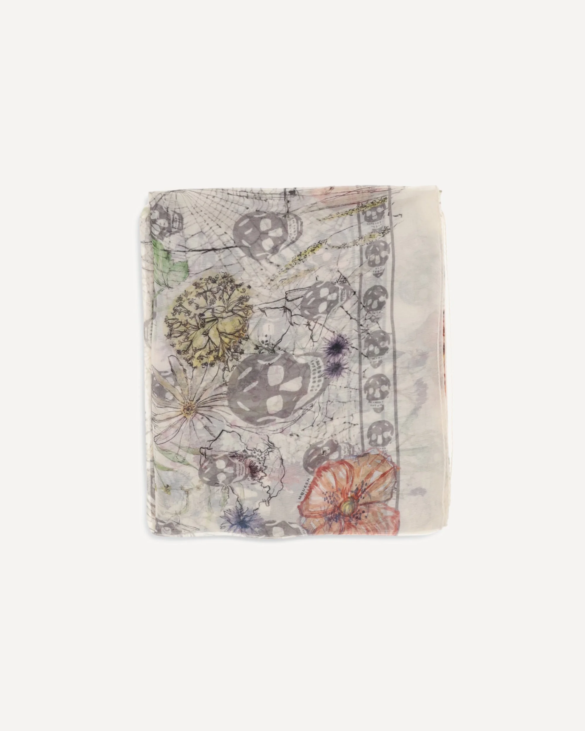 The Skull & Spider Floral Scarf by Alexander McQueen is a distinctive piece that combines elegance and boldness. Crafted from ivory and medium gray silk chiffon, it features a ladder-like openwork design and an all-over Skull motif, enriched by a multicolored Spider Floral print. The edge is decorated with the Skull motif, while the McQueen logo appears in the lower right corner, adding a final touch of luxury. A perfect accessory for those looking for a mix of sophisticated style and a touch of boldness. DETAILS - Sku: 8585313052Q_9262 - Season: SS26 - Dimension: 120x104 - Composition: GENERAL 100% Silk - MADE IN ITALY