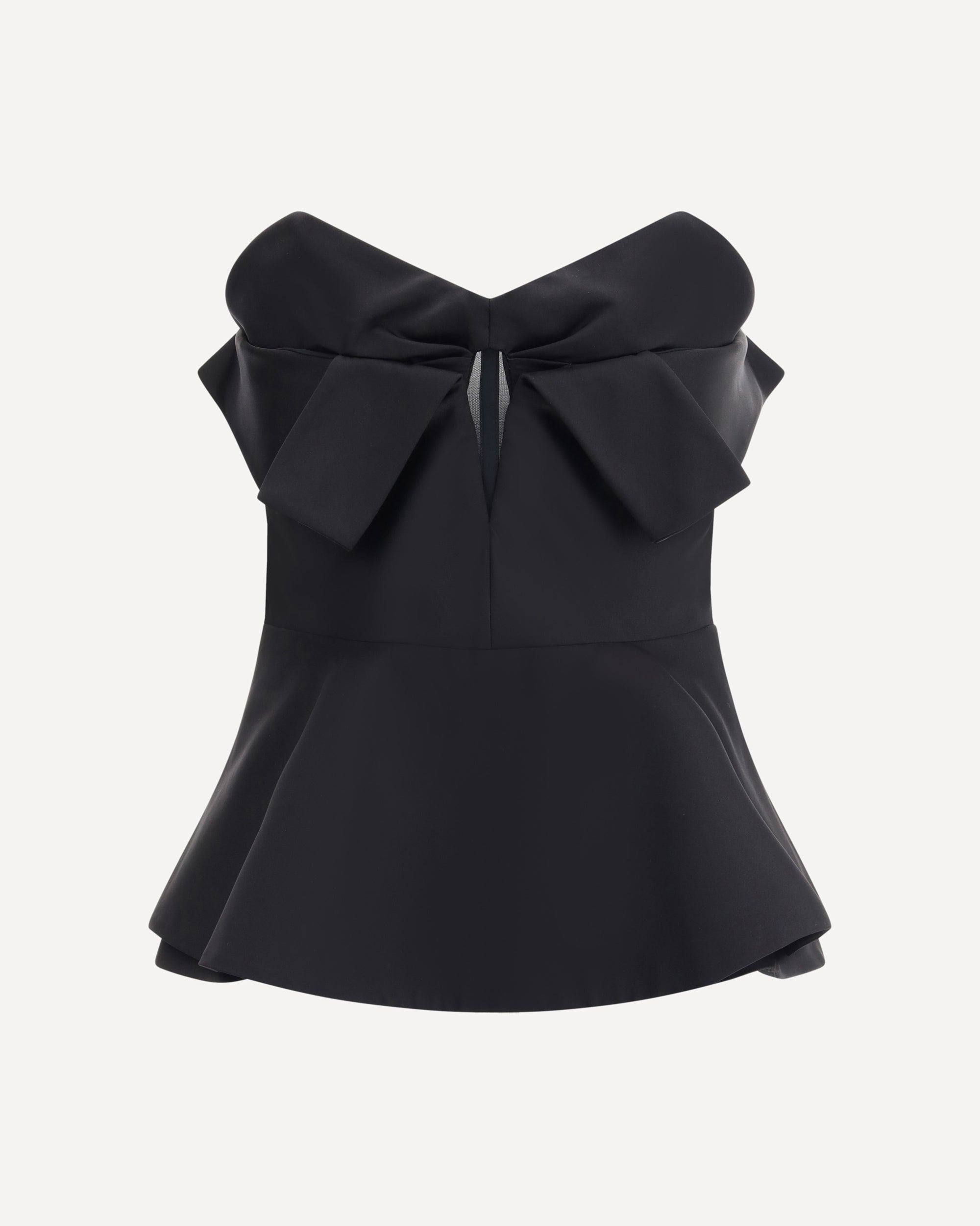 Alexander McQueen's sleeveless corset Top features a figure-flattering fitted silhouette embellished with a majestic bow at the neckline. At the bottom, a wide, shapely peplum elegantly enhances the feminine form. Made of a delicately shiny fabric, the garment is completed with a classic back zipper for a comfortable and discreet closure. DETAILS - Sku: 839622QEAGH_1000 - Season: AW25 - Fit: Regular - Composition: GENERAL 61% Polyester 39% Silk - MADE IN ITALY