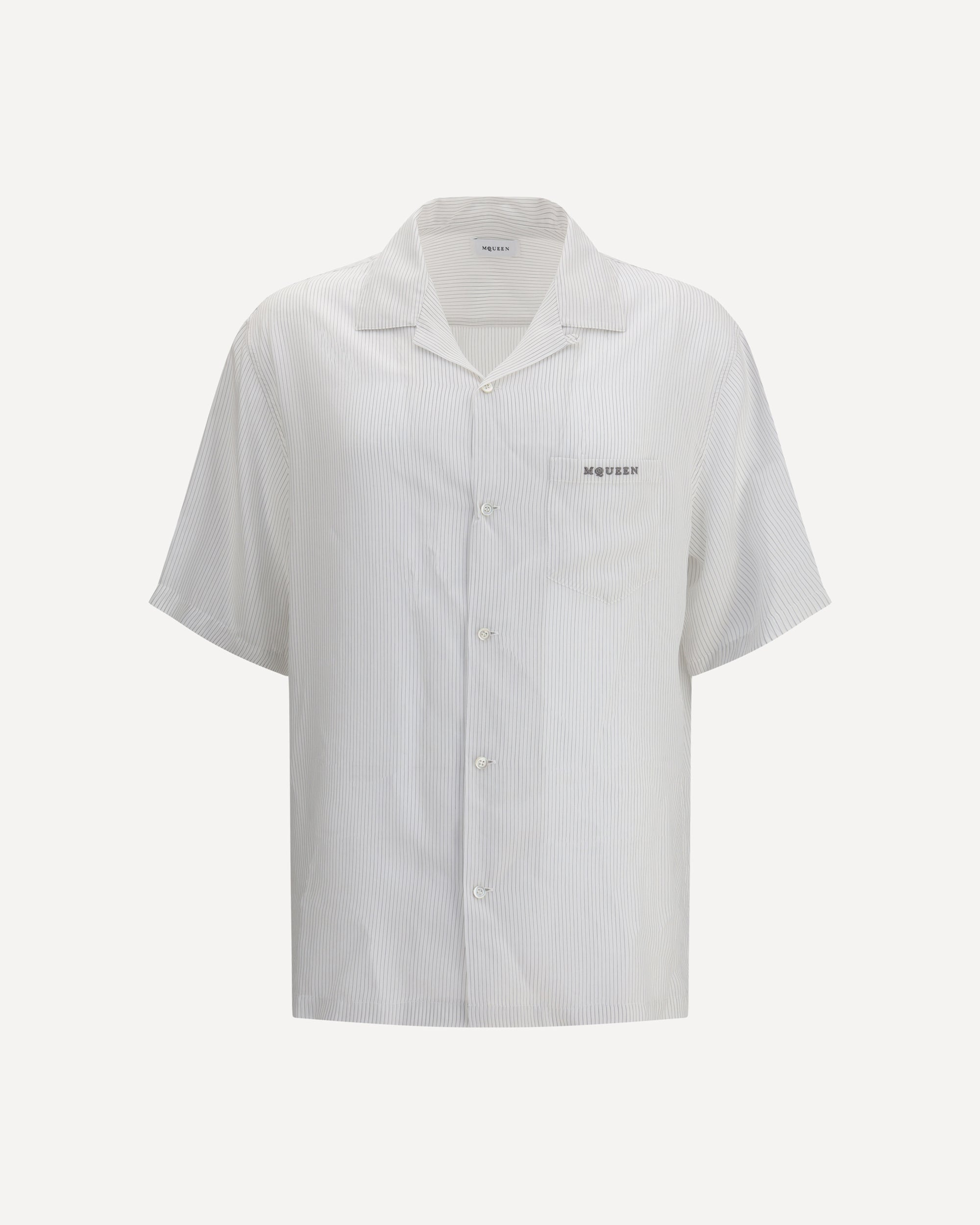 Alexander McQueen's thin striped Shirt reinterprets the classic Hawaiian pattern with elegance and attention to detail. Featuring a front button closure and a patch pocket on the chest, it is embellished with the embroidered logo that signs the garment with discreet sophistication. A perfect blend of relaxed fit and sophistication. DETAILS - Sku: 826631QRAB7_9228 - Season: AW25 - Fit: Regular - Composition: GENERAL 80% Viscose 20% Polyester - MADE IN ROMANIA