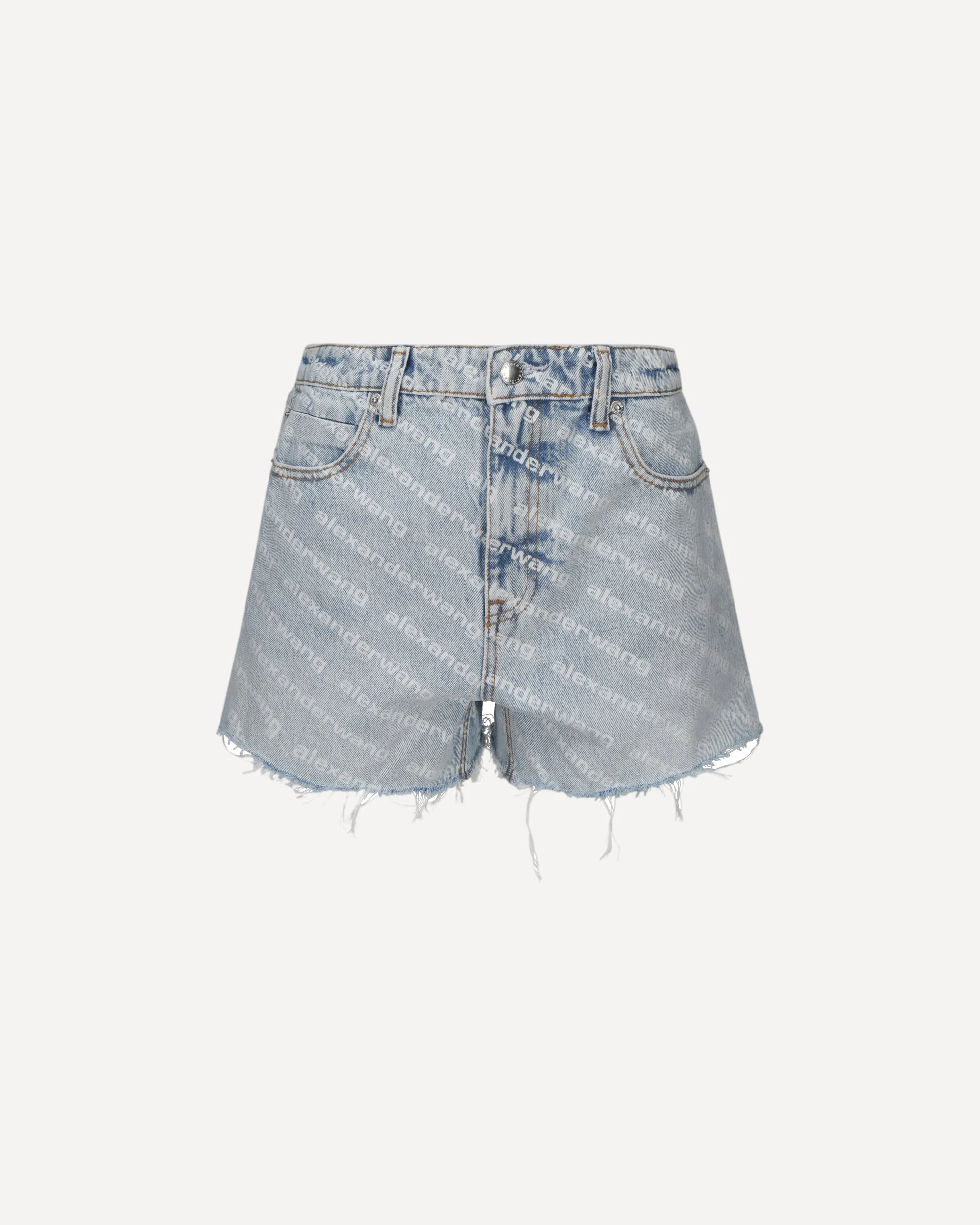 Denim Shorts by Alexander Wang, featuring a zipper and button fastening, belt loops, a five pocket design, a washed out effect, a contrasting repeating logo across the body, a logo patch at the rear and a ripped hem. DETAILS sku 4DC2204781_270 composition : COTTON 100% color group : BLUE gender : WOMAN season : AW23 size chart : WOMAN DENIM US category name : BERMUDA SHORTS