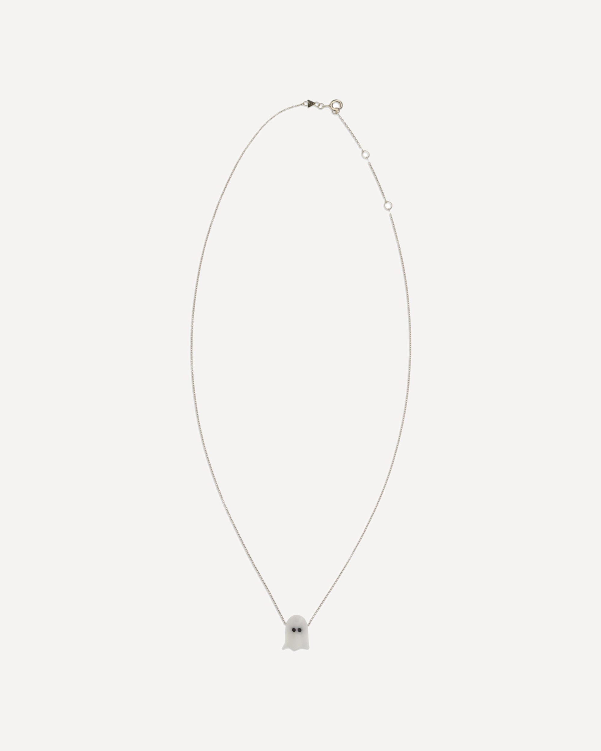 Ghost Necklace by Aliita is an ironic and surprising piece of jewelry, perfect for those who love out-of-the-box details. The ghost-shaped pendant, made of white coral with black Belgian marble detailing, is mounted on a 9-karat yellow gold rolo chain with a ring clasp. A fun yet refined accessory that adds a touch of mystery and originality to any look. DETAILS - Sku: NRCOA400CEYG09K_J1000 - Season: SS26 - Composition: GENERAL 100% Others Materials - MADE IN ITALY