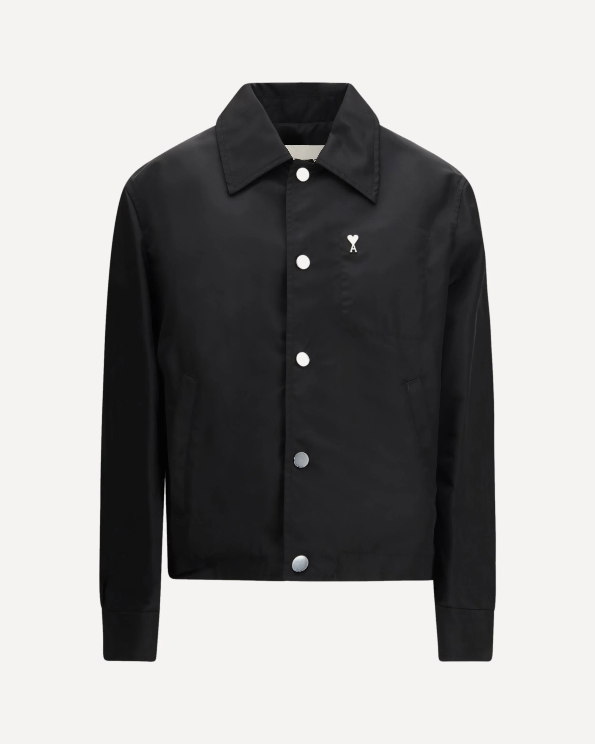 The buttoned Jacket with Ami de Coeur stud by Ami Paris delivers a clean and contemporary technical aesthetic. Crafted from water-repellent technical nylon, it features a streamlined construction with a snap-button front closure and a top snap at the neckline finished with an Ami signature tab. Front welt pockets with concealed snap buttons preserve the minimalist design, while an adjustable drawstring at the waist with Ami Paris metal eyelets allows for a customizable fit. The tone-on-tone Ami de Coeur metal stud on the chest signs the piece with an iconic detail, defining a unisex design with refined functional appeal. DETAILS - Sku: UJK872PA0037_001 - Season: SS26 - Fit: Regular - Composition: GENERAL 100% Polyamide - MADE IN ROMANIA