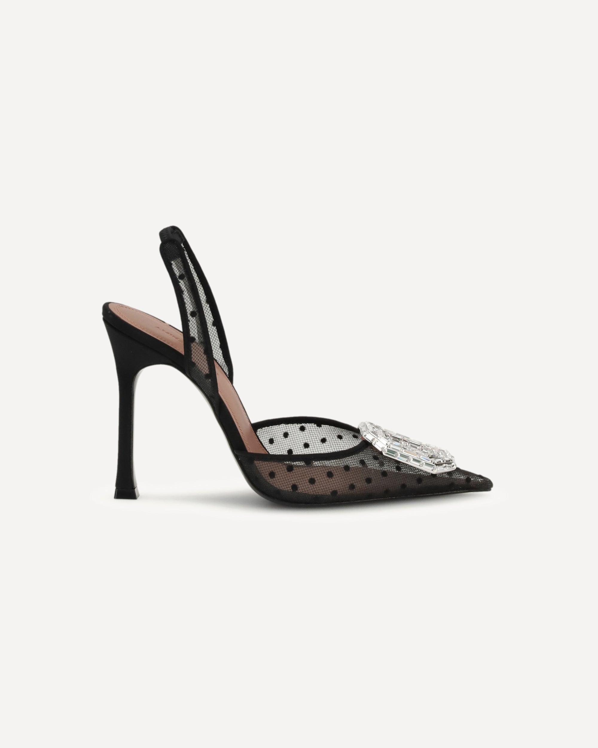 The Camelia Sling 105 Pumps in Polka-Dot Lace by Amina Muaddi embody refined femininity and contemporary allure. Crafted from black polka-dot satin, these pumps feature a pointed toe adorned with a rectangular mirrored embellishment for a touch of glamour. The slingback strap ensures a graceful fit, while the brand’s signature 105mm sculptural heel adds a modern, elevated finish — perfect for evening elegance. DETAILS - Sku: 15S365654CAM_BLACK - Season: AW25 - Composition: UPPER 100% Glass SOLE 100% Calf Leather Bos Taurus - MADE IN ITALY