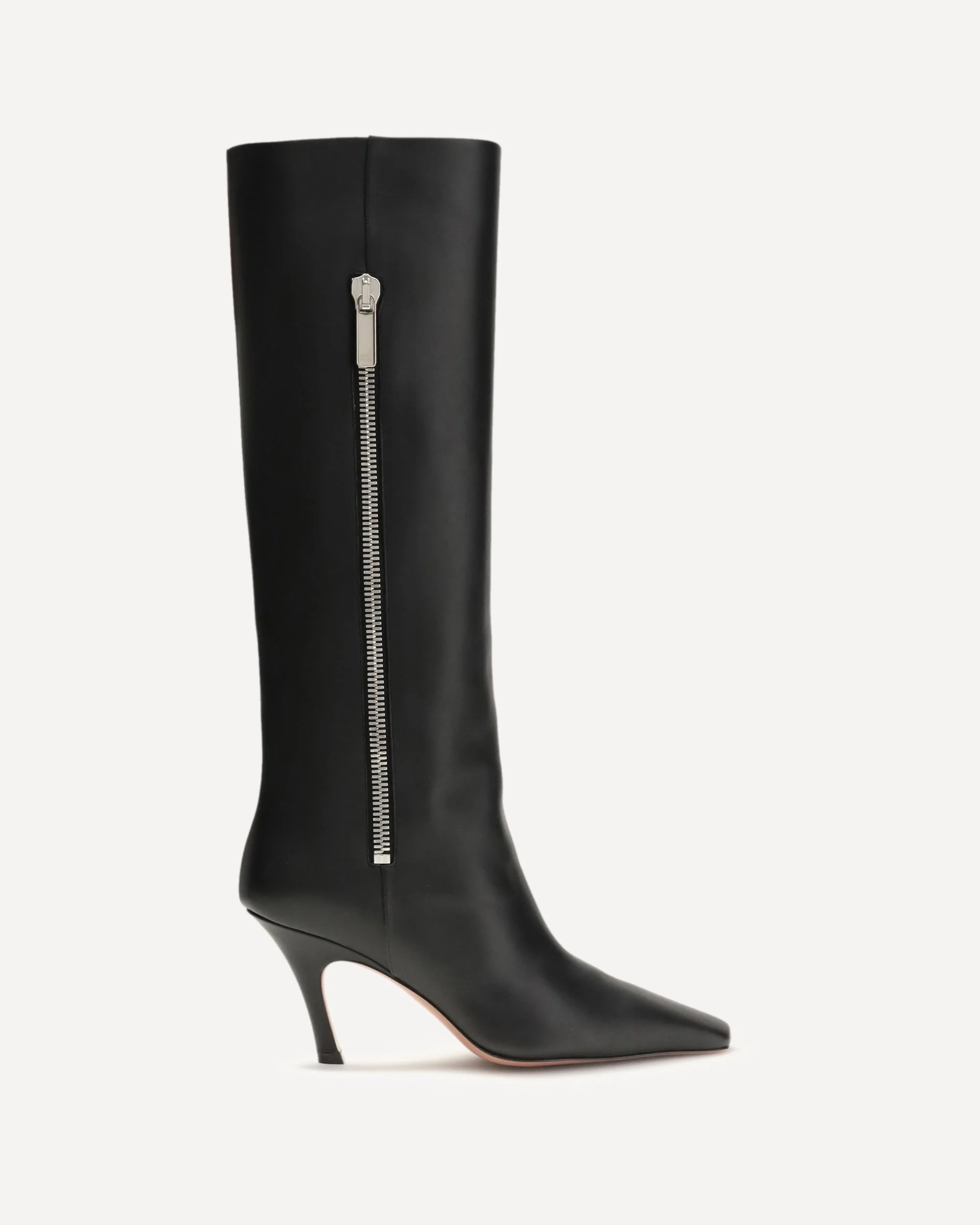The Mona Boot 80 leather Boots by Amina Muaddi are a sophisticated and contemporary design, featuring the unmistakable 80 mm slanted heel that lends a modern, sculptural allure to the silhouette. Made of fine calfskin leather, they stand out for their clean lines, elegant structure and essential design that enhances any look. They also feature a practical external zippered pocket, a functional and distinctive detail that adds an urban touch to the model. A shoe with a strong character, perfect for completing both everyday and more sophisticated outfits. DETAILS - Sku: 15S365751MON_BLACK - Season: AW25 - Composition: UPPER 100% Calf Leather Bos Taurus SOLE 90% Calf Leather Bos Taurus 10% Polyurethane - MADE IN ITALY