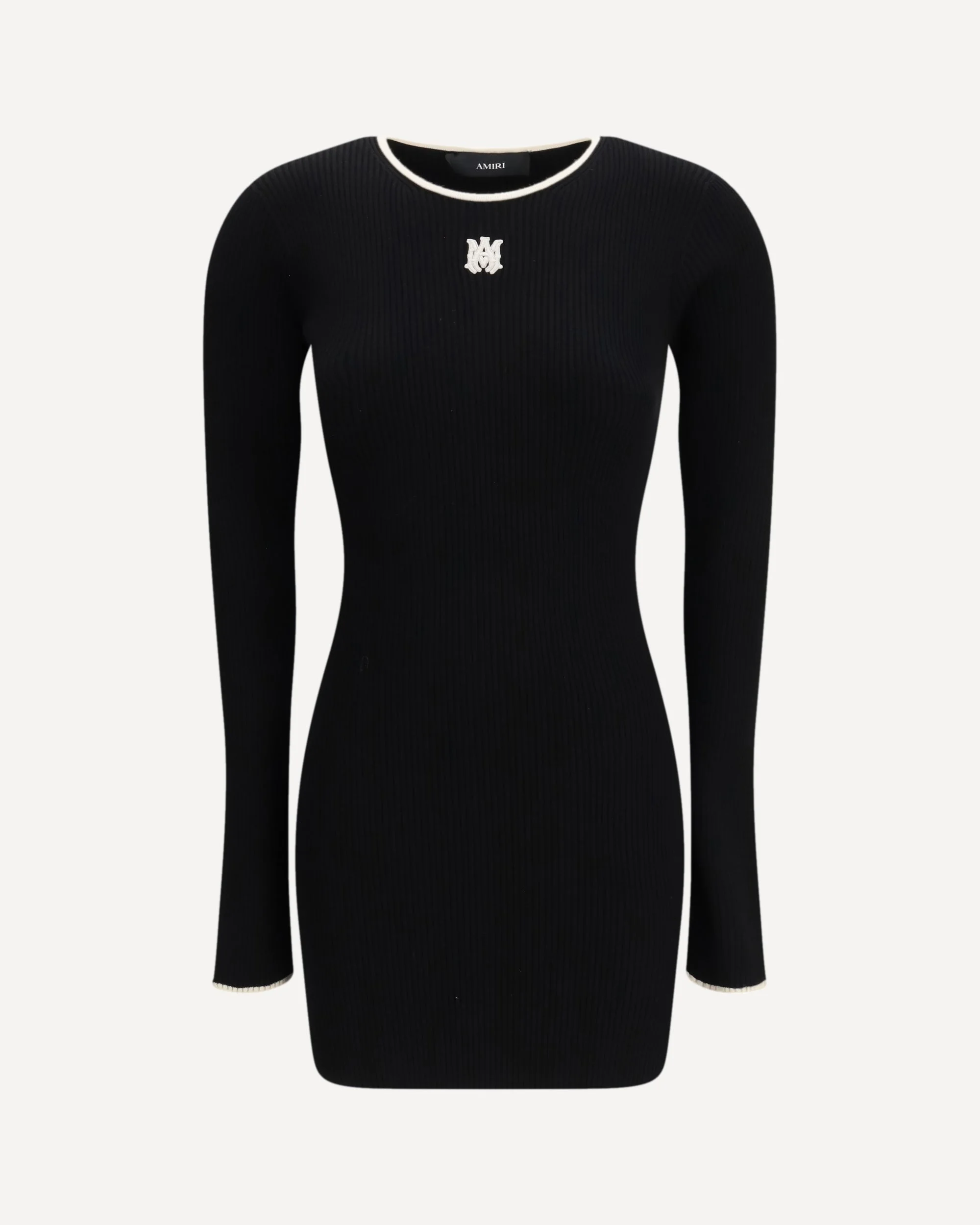 The short fitted Dress by Amiri is an elegant and modern piece, made from a ribbed fabric that accentuates the silhouette. With long sleeves and a round neckline, the minimalist design is embellished with a contrasting embroidered logo on the front, adding a distinctive touch. Perfect for those looking for a sophisticated yet comfortable and versatile style. DETAILS - Sku: AWDRCA1092_001 - Season: SS26 - Fit: Slim - Composition: GENERAL 70% Viscose 30% Polyester - MADE IN ITALY