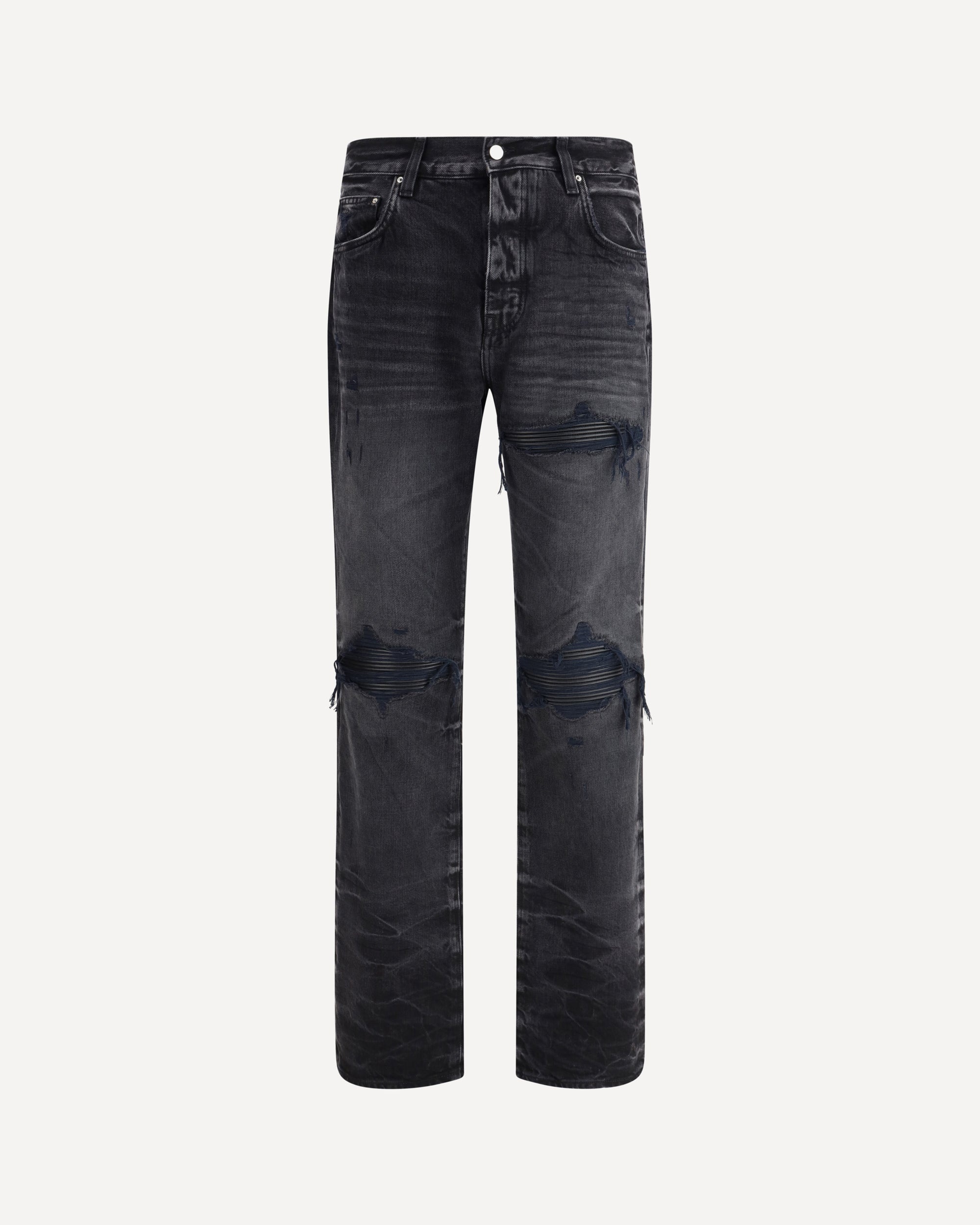 Amiri's Mx1 cotton Jeans express the brand's rock spirit and vintage aesthetic through refined details and premium materials. Featuring a straight five-pocket design, they feature a front button closure and belt loops at the waist. The worn effect design with leather inserts gives a worn but sophisticated look, while a logoed leather patch, applied on the back, signs the garment with the unmistakable Amiri identity. Ideal for those who want a bold and authentic style. DETAILS - Sku: AMDNGH1086_VINTAGEBLA - Season: AW25 - Fit: Regular - Composition: GENERAL 90% Cotton 10% Leather - MADE IN U.S.A.