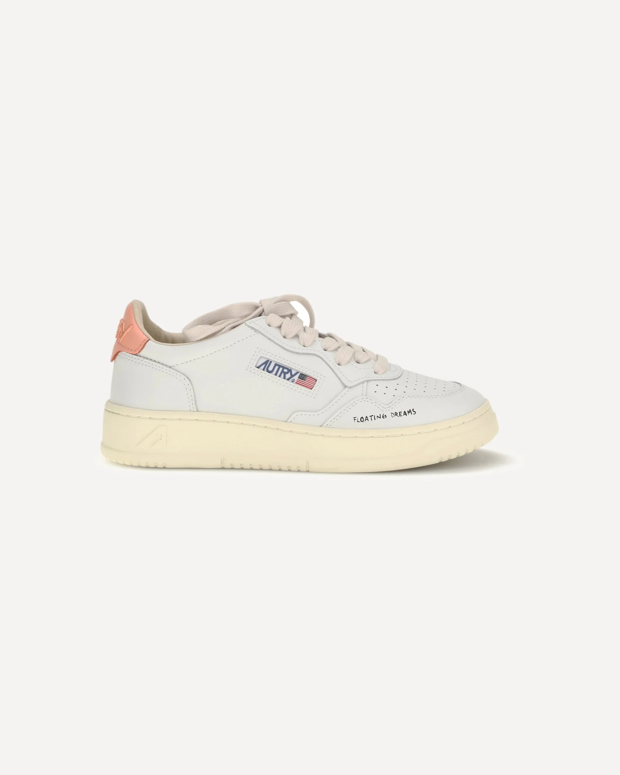 The Medalist Low leather Sneakers by Autry combine elegance and distinctive details in a casual yet sophisticated design. The perforated round toe and lace-up closure offer a comfortable fit, while the leather tongue with tone-on-tone logo label adds a subtle touch of luxury. The contrasting heel tab with embossed logo and contrasting monogram on the side panel give the model character. The "floating dreams" lettering on the front adds a unique and poetic detail. The logo-embossed leather insole completes the design, creating the perfect look for those seeking style and comfort in a single pair of shoes. DETAILS - Sku: AULWDL03_WHTPEACHP - Season: SS26 - Composition: UPPER 100% Calf Leather Bos Taurus SOLE 100% Rubber - MADE IN INDONESIA