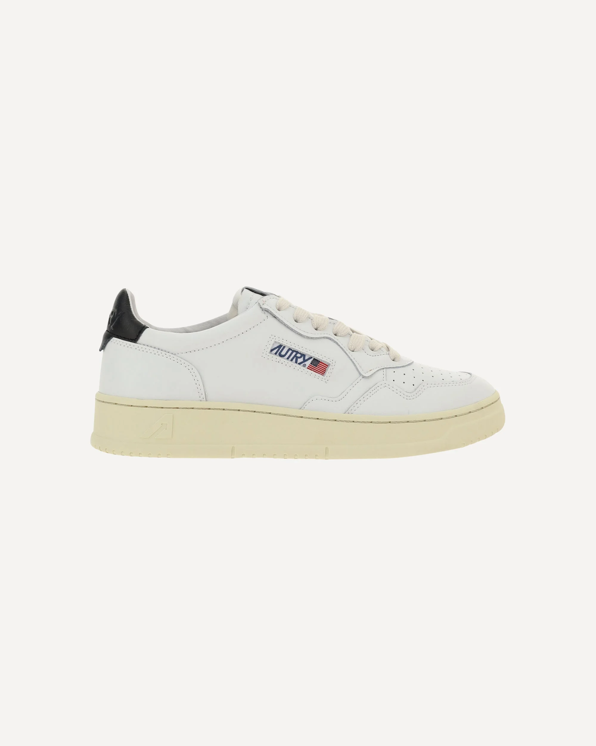 Calfskin Leather Sneakers by Autry, round and perforated toe, frontal lace up closure, tonal label seamed on a leather tongue, iconic back patch in contrast with embossed logo, branded sole in rubber, iconic lateral U.S. flag detail with logo. DETAILS - Sku: AULMLL22_WHTBLACK - Season: AW25 - Composition: GENERAL 100% Calf Leather Bos Taurus - MADE IN INDONESIA