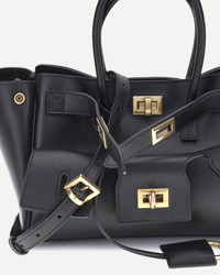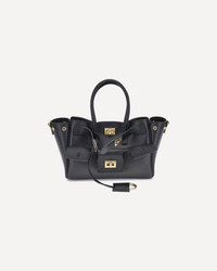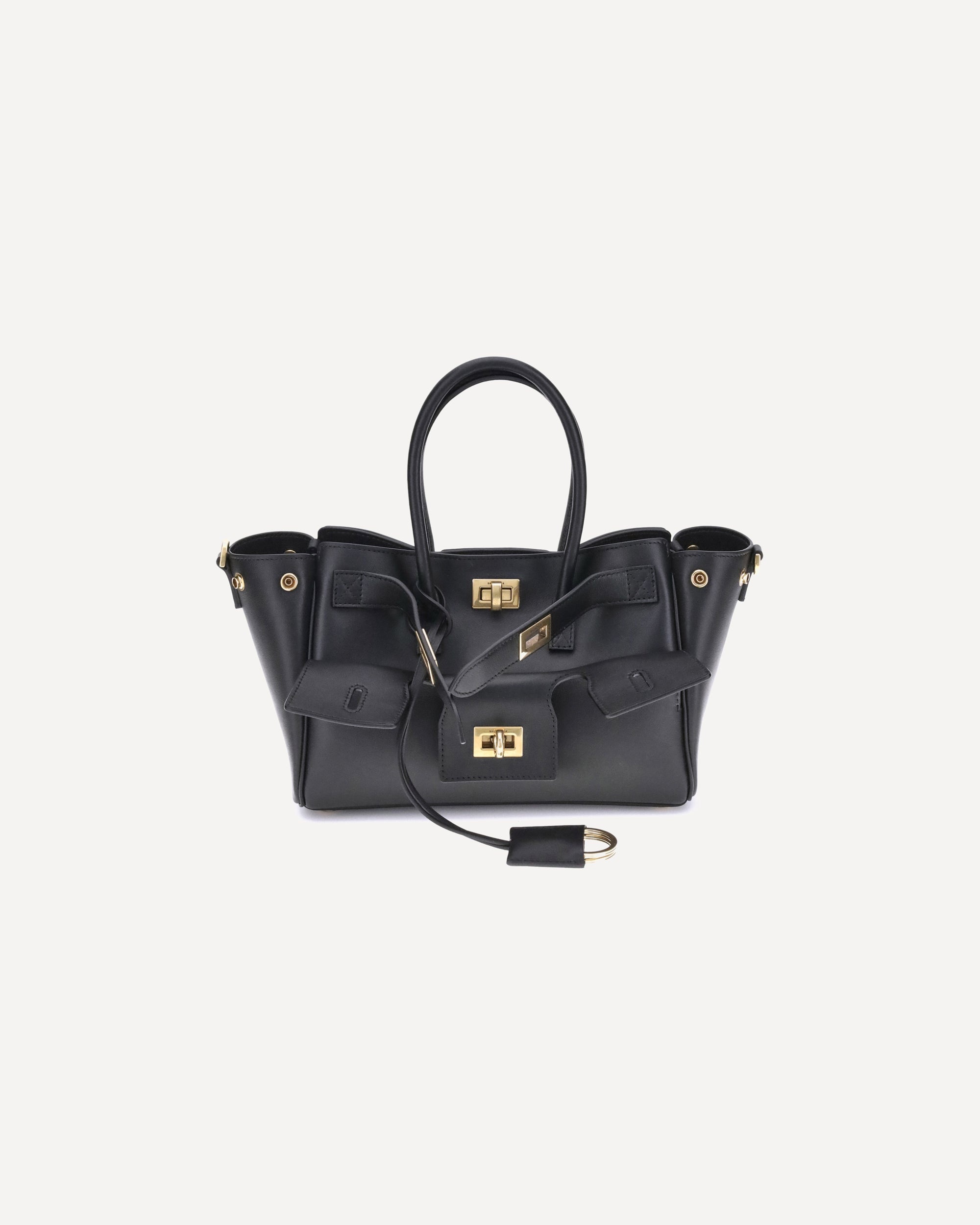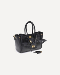 Balenciaga's Bel Air mini Handbag is a versatile and iconic accessory. Carried on the shoulder, over the shoulder or by hand, it features two handles and an adjustable, removable shoulder strap. The embossed Balenciaga Paris logo with lamination decorates the back. Antiqued gold hardware, a removable key ring, side snap buttons and a swivel closure and engraved logo belts complete the design. It offers a large front pocket, an open main compartment and two interior zippered pockets, combining style and functionality. DETAILS - Sku: 8357322ABAV_1000 - Season: AW25 - Dimension: 23.5x23.5x8 - Composition: GENERAL 100% Calf Leather Bos Taurus - MADE IN ITALY