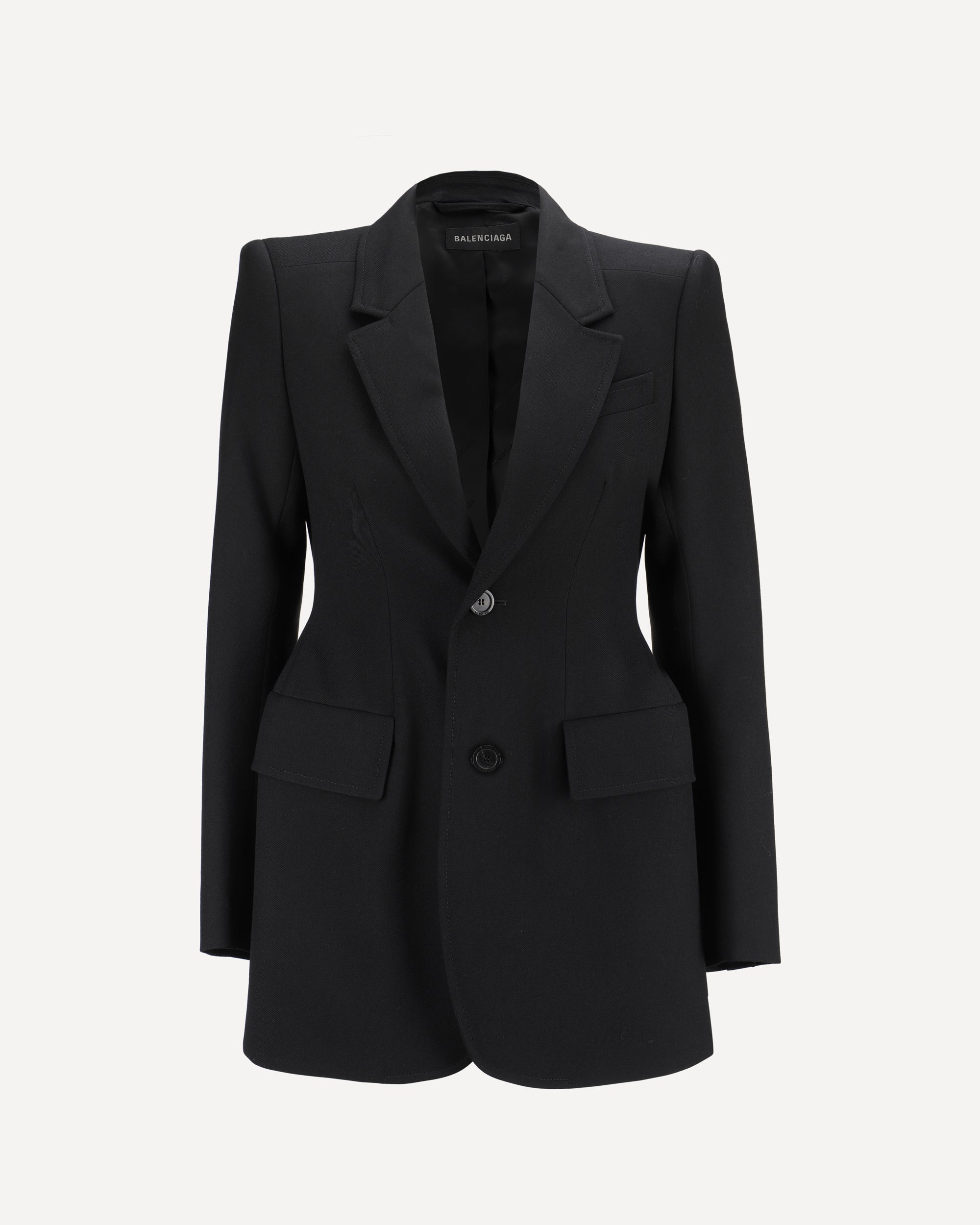 Wool Blazer Jacket by Balenciaga featuring front button closure, classic lapels, two side flap welt pockets, one front welt pocket, structured shoulders, regular fit. DETAILS sku 571278TYI20_1000 composition: WOOL 100% color group: BLACK gender: WOMAN season: AW24 size chart: RTW FR category name: JACKETS