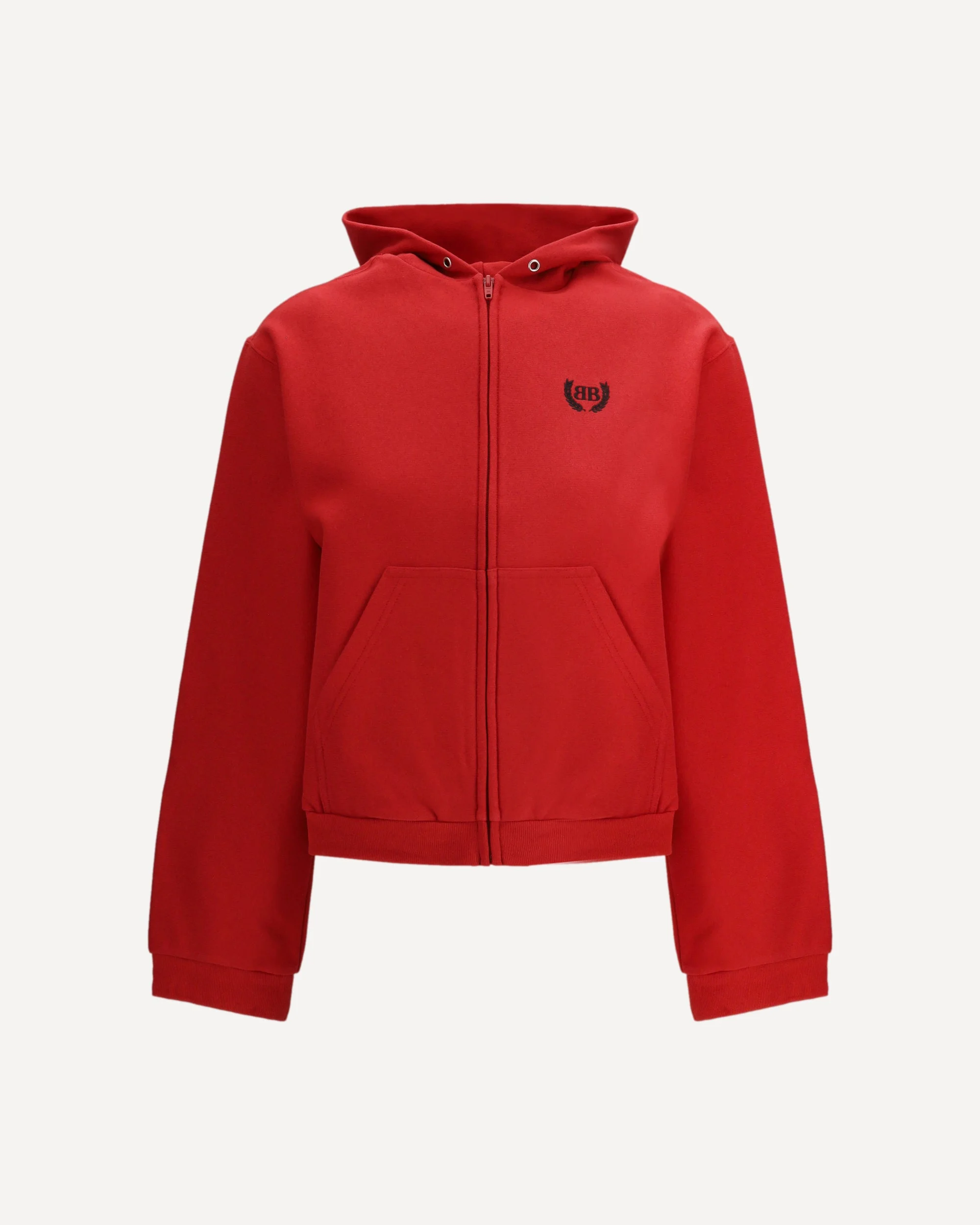 The Laurel Classic zip-up Hoodie by Balenciaga conveys a refined sporty attitude through a compact dry-fleece construction. The hood without drawstring and the zip fastening shape a clean design, while soft shoulders and a more fitted structure at the cuffs and hem balance the silhouette. Front pockets add practicality, finished with the Laurel Classic embroidery on the front as a distinctive signature. DETAILS - Sku: 851236TSVC6_6167 - Season: SS26 - Fit: Regular - Composition: GENERAL 100% Cotton - MADE IN PORTUGAL