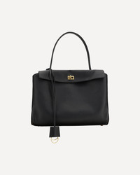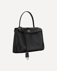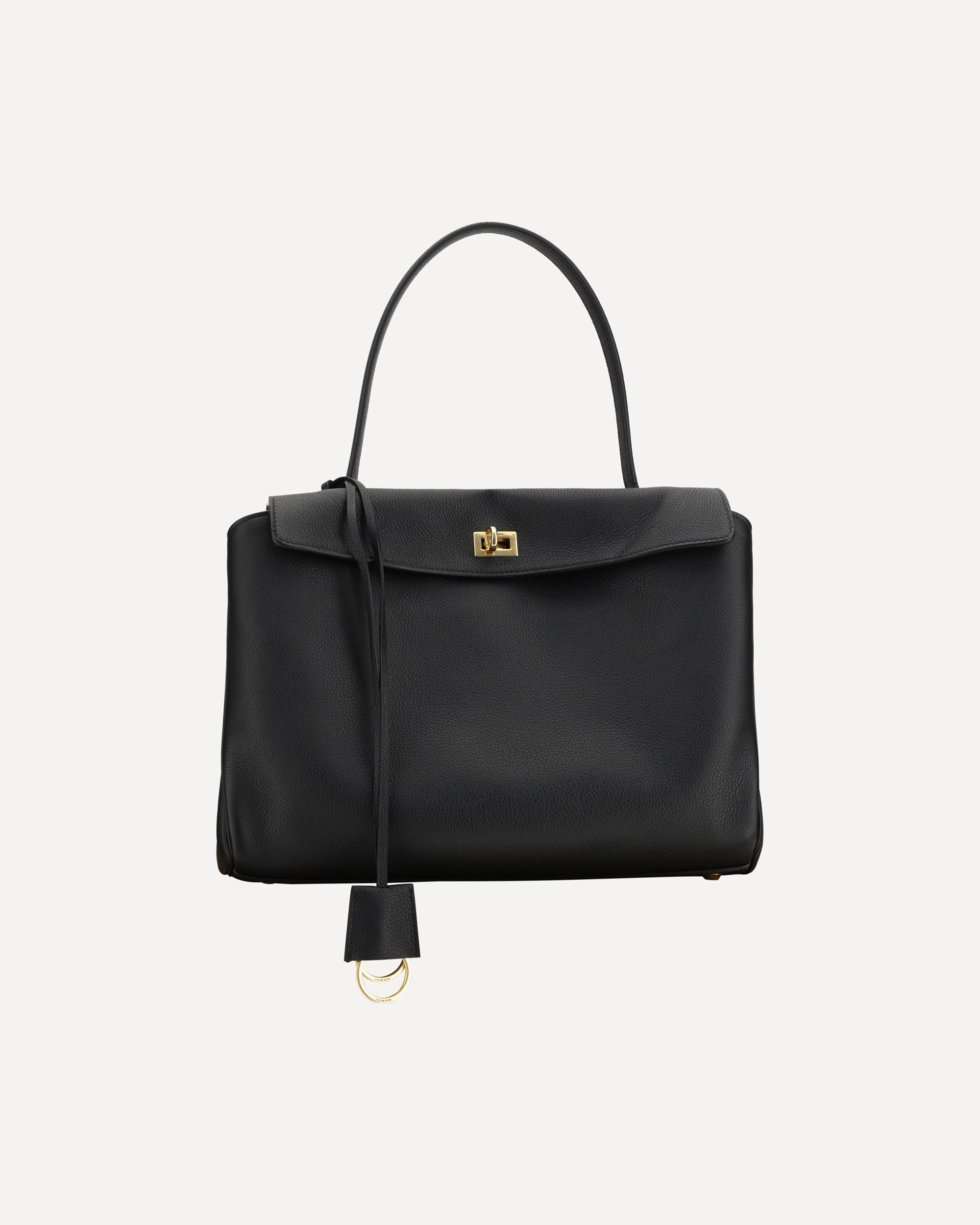 Balenciaga's Rodeo Leather Shoulder Bag features a top handle for a comfortable and stylish grip. The front closure features a flap and swivel, adding a distinctive and functional detail. Applied keychain detail on the top handle. The removable shoulder strap is attached by snap hooks, allowing it to be carried either on the shoulder or by hand. Inside, the bag offers single interior compartment, ideal for organizing essentials. In addition, there are metal feet at the base of the bag to protect it and keep it in place. DETAILS - Sku: 7897722ABV5_1000 - Season: SS25 - Dimension: 35x35x10.9 - Composition: GENERAL 100% Calf Leather Bos Taurus - MADE IN ITALY