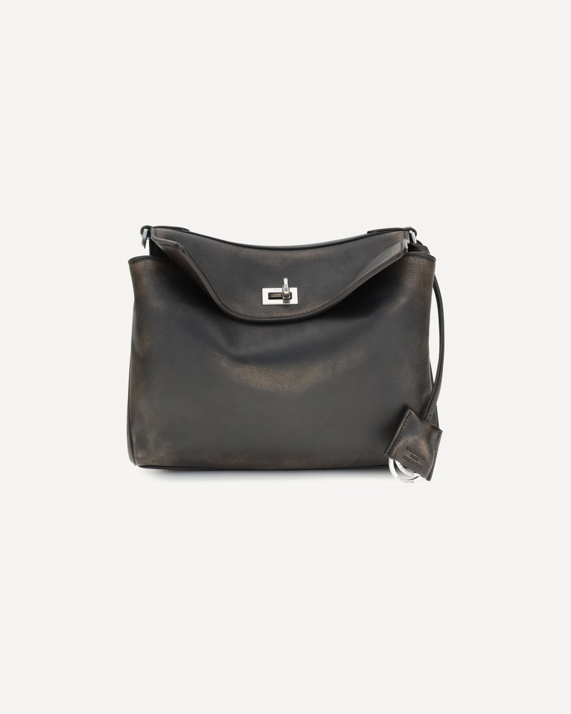 Balenciaga's Rodeo small Shoulder Bag, designed for the modern man, is crafted from two-tone calfskin with a distressed effect, giving it a bold, contemporary feel. The messenger design is complemented by an adjustable and removable car-belt-style shoulder strap, complemented by a second leather shoulder strap for added versatility. Featuring a practical twist lock closure, it features a spacious main compartment, interior and exterior pockets, and functional details such as a removable key ring, side snaps, and brass feet. Antique silver hardware adds a distinctive touch. DETAILS - Sku: 8275832ABWZ_9862 - Season: AW25 - Dimension: 24x24x11 - Composition: GENERAL 100% Lamb Ovis Aries Aries - MADE IN ITALY