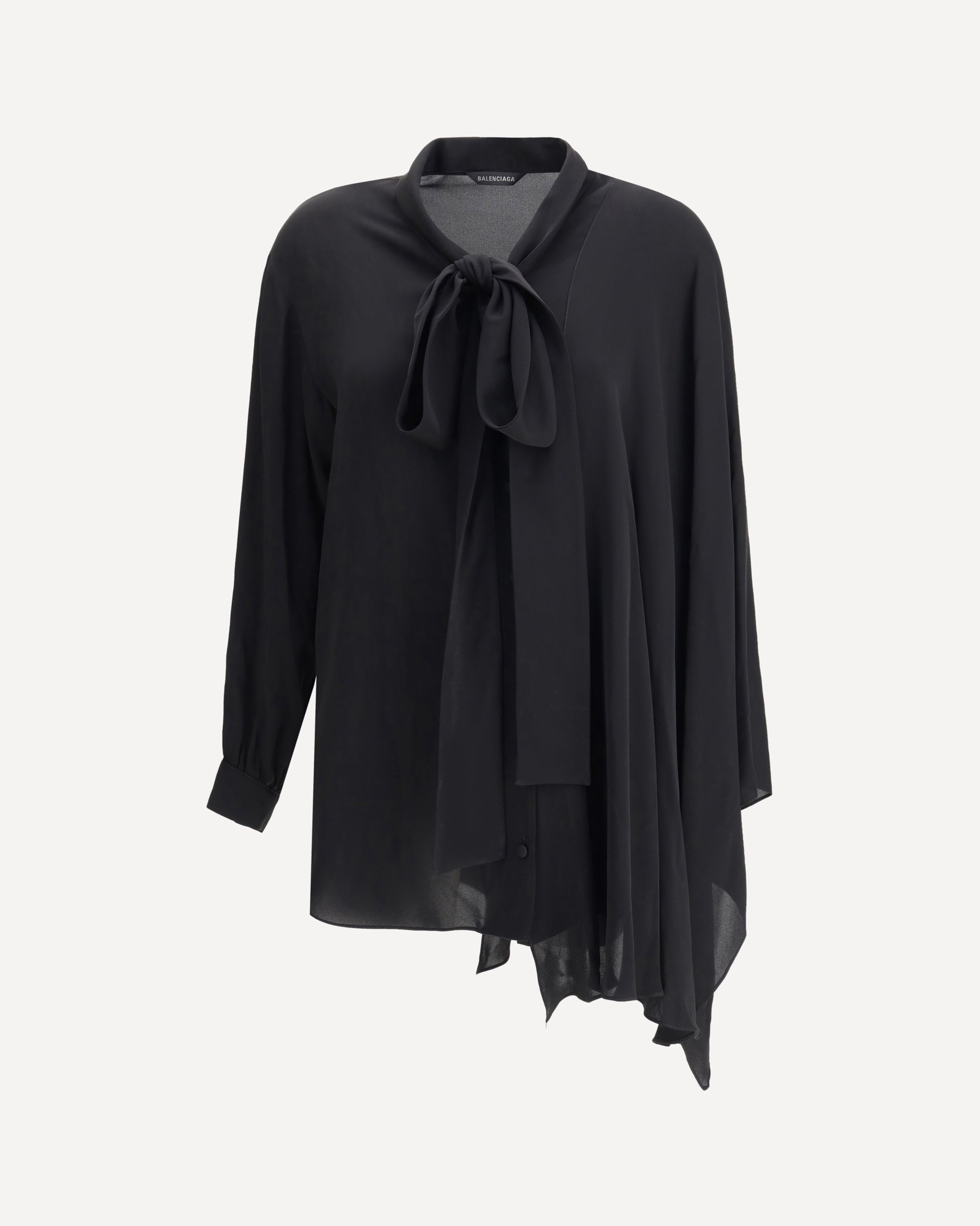 Balenciaga's asymmetrical Blouse is made of lightweight and fluid pure silk georgette. The sophisticated design is enriched with elegant ribbons to tie at the neck, a batwing sleeve and a long sleeve with a button-adjustable cuff. The front button closure completes the garment, while the loose fit ensures comfort and movement. A refined and striking pattern, perfect for feminine looks with contemporary style. DETAILS - Sku: 839280TIN13_1000 - Season: AW25 - Fit: Oversize - Composition: GENERAL 100% Silk - MADE IN ITALY