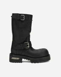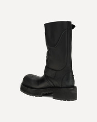 Venom Boots by Balenciaga are a bold and contemporary interpretation of urban style. Featuring an ultra-round toe and a 20 mm curvature, they stand out for their worn-in effect that gives a worn-in, gritty look. Belt-inspired straps with adjustable buckles add an industrial touch, while the Balenciaga logo and Parisian address 10 AV George V are embossed on the upper as a hallmark. Complemented by an engraved logo plaque on the side of the sole and a thick notched rubber sole, they combine rugged aesthetics and functionality. DETAILS - Sku: 833585WCAL1_1080 - Season: AW25 - Composition: UPPER 100% Calf Leather Bos Taurus SOLE 100% Rubber - MADE IN ITALY