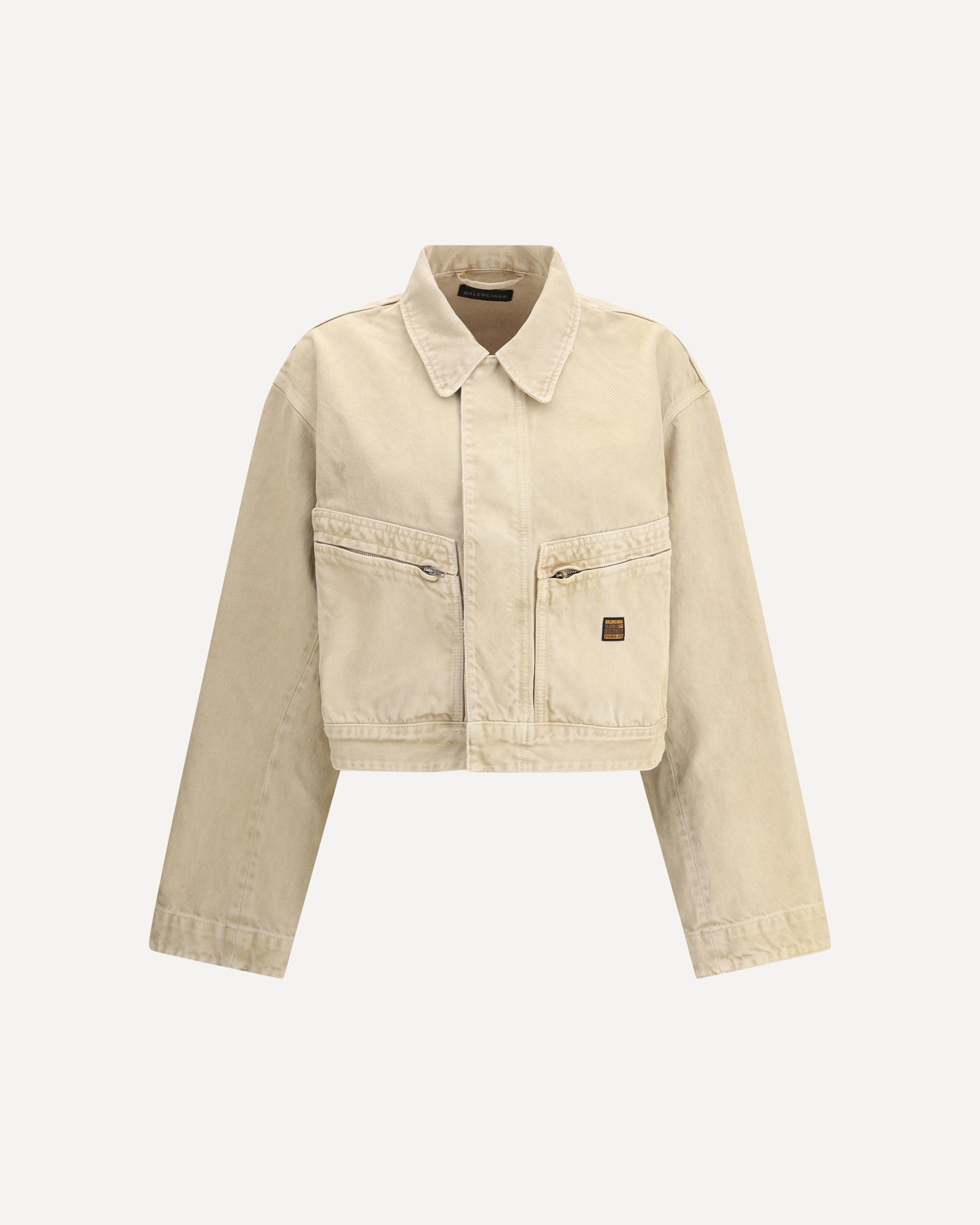 Balenciaga's Workwear crop Jacket reinterprets workwear with a modern and sophisticated twist. Featuring a classic collar, zipper front closure and snaps, it has two zippered patch pockets and a mini logo patch on the front. The worn-in design gives the garment an authentic and contemporary allure, ideal for those seeking style and functionality. DETAILS - Sku: 842161TSWB2_9501 - Season: AW25 - Fit: Regular - Composition: GENERAL 100% Cotton - MADE IN JAPAN