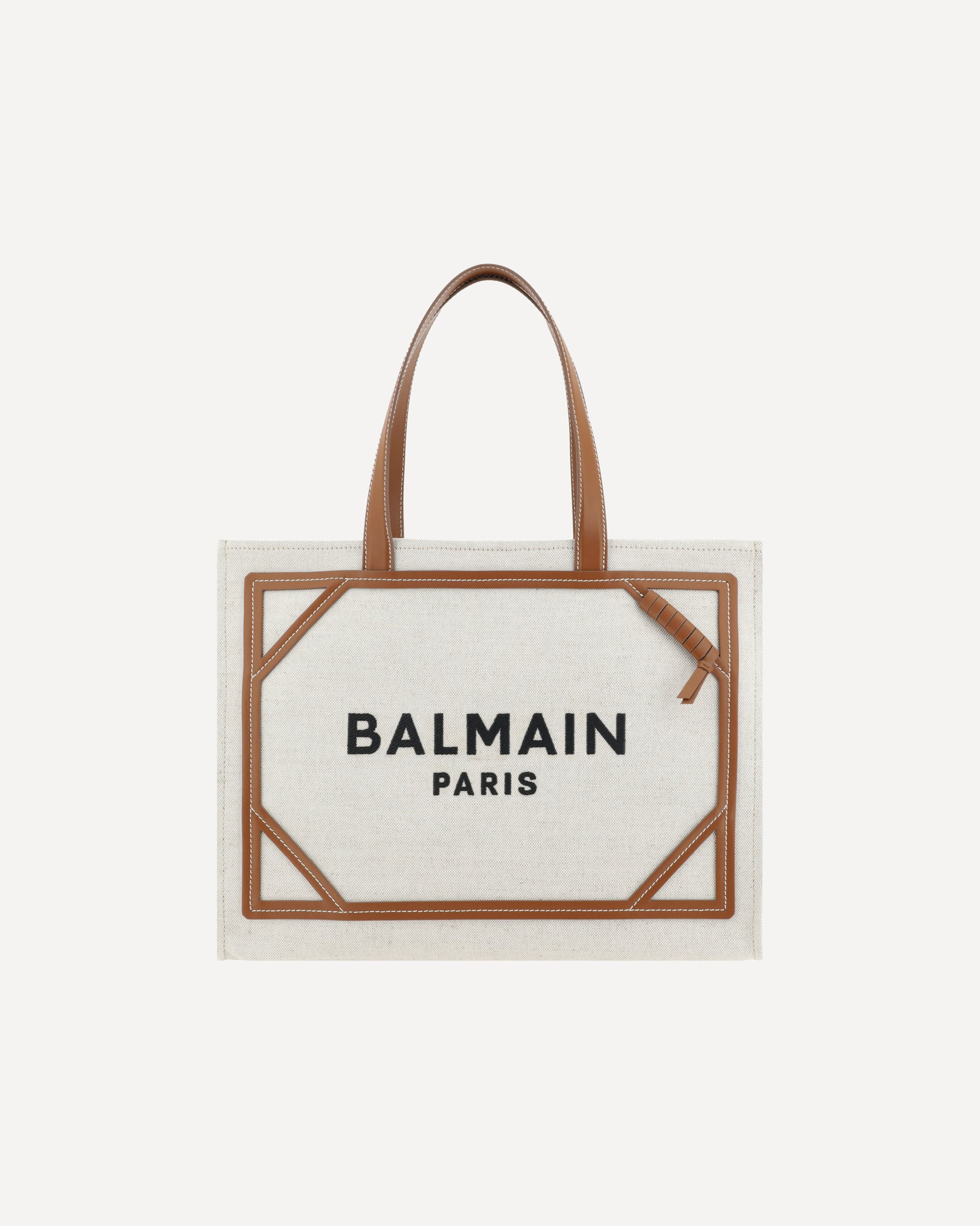Cotton B-Army Medium Shoulder Bag by Balmain features flat top leather handles, contrasting embroidered iconic brand monogram at front, leather details, top hook closure, interior pouch, single interior compartment DETAILS sku DN1FF810TDCS_GEM composition: COTTON 80% CALF LEATHER BOS TAURUS 20% color group: BEIGE gender: WOMAN season: SS25 size chart: UNI category name: HANDBAGS dimensions: 32 x 42 x 16 cm