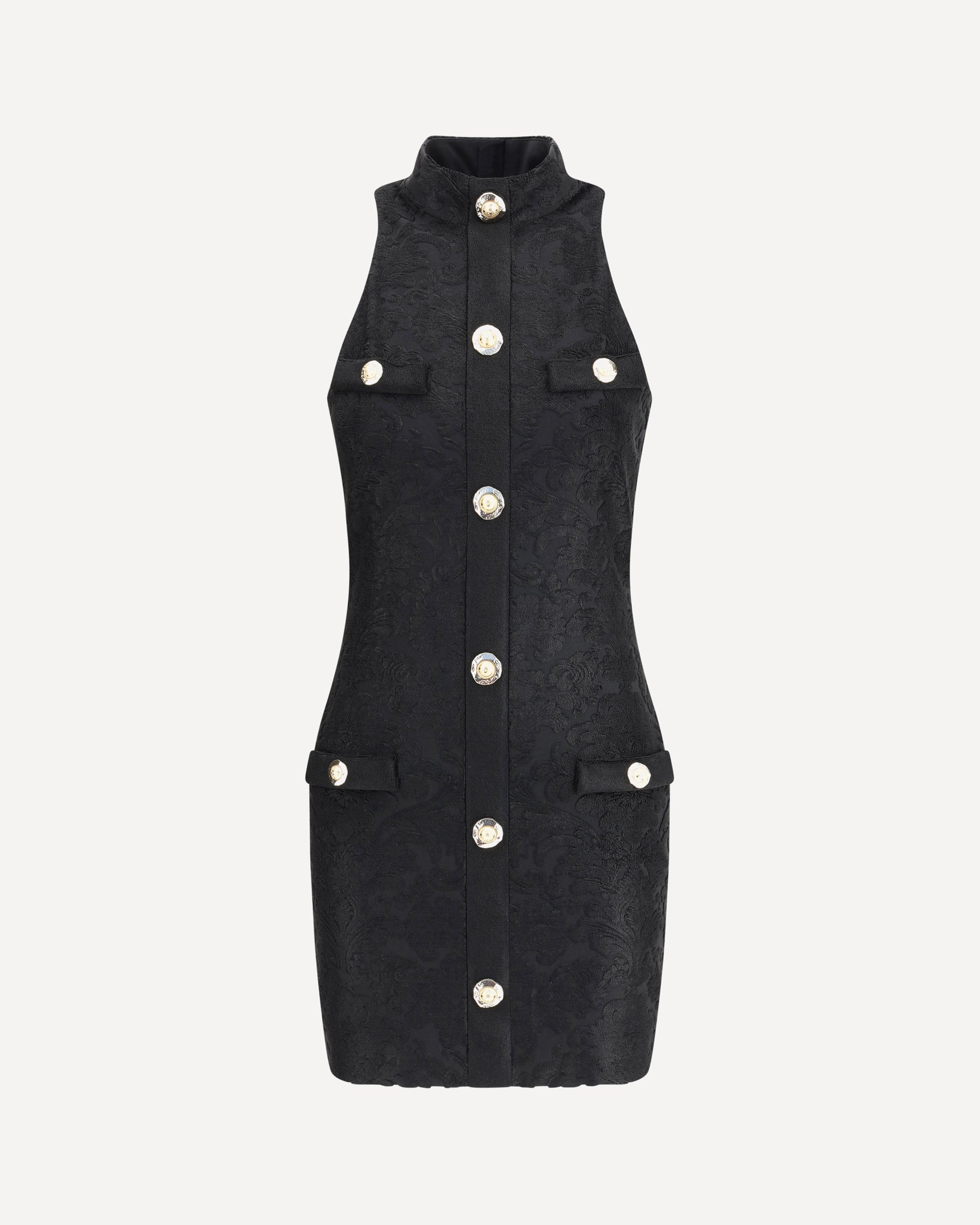 Balmain's Baroque short Dress combines elegance and character in a refined design. Made of boucle fabric with a rich baroque pattern, it features an American collar that enhances the silhouette and a back zipper closure. Gold embossed buttons on the front add an iconic and luxurious touch typical of Balmain style. DETAILS - Sku: FF1R5127JK65_0PA - Season: AW25 - Fit: Slim - Composition: GENERAL 100% Polyester - MADE IN FRANCE