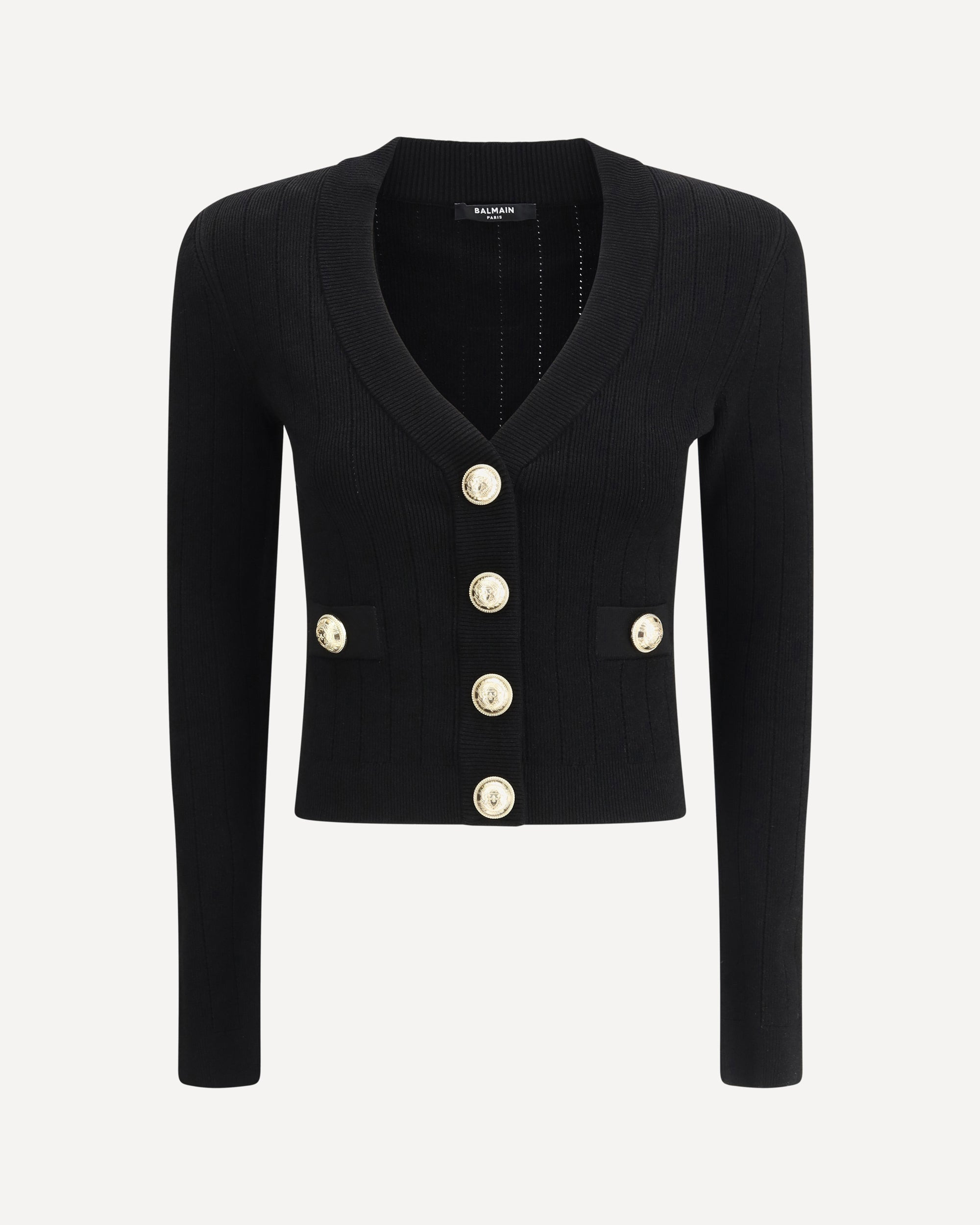 Cardigan by Balmain, cropped design, v-neck on front, closure by embossed buttons, close fit, monochrome pattern. DETAILS sku DF1KL007KB07_0PA composition: VISCOSE 83% POLYESTER 17% color group: BLACK gender: WOMAN season: AW24 size chart: RTW FR category name: KNITWEAR
