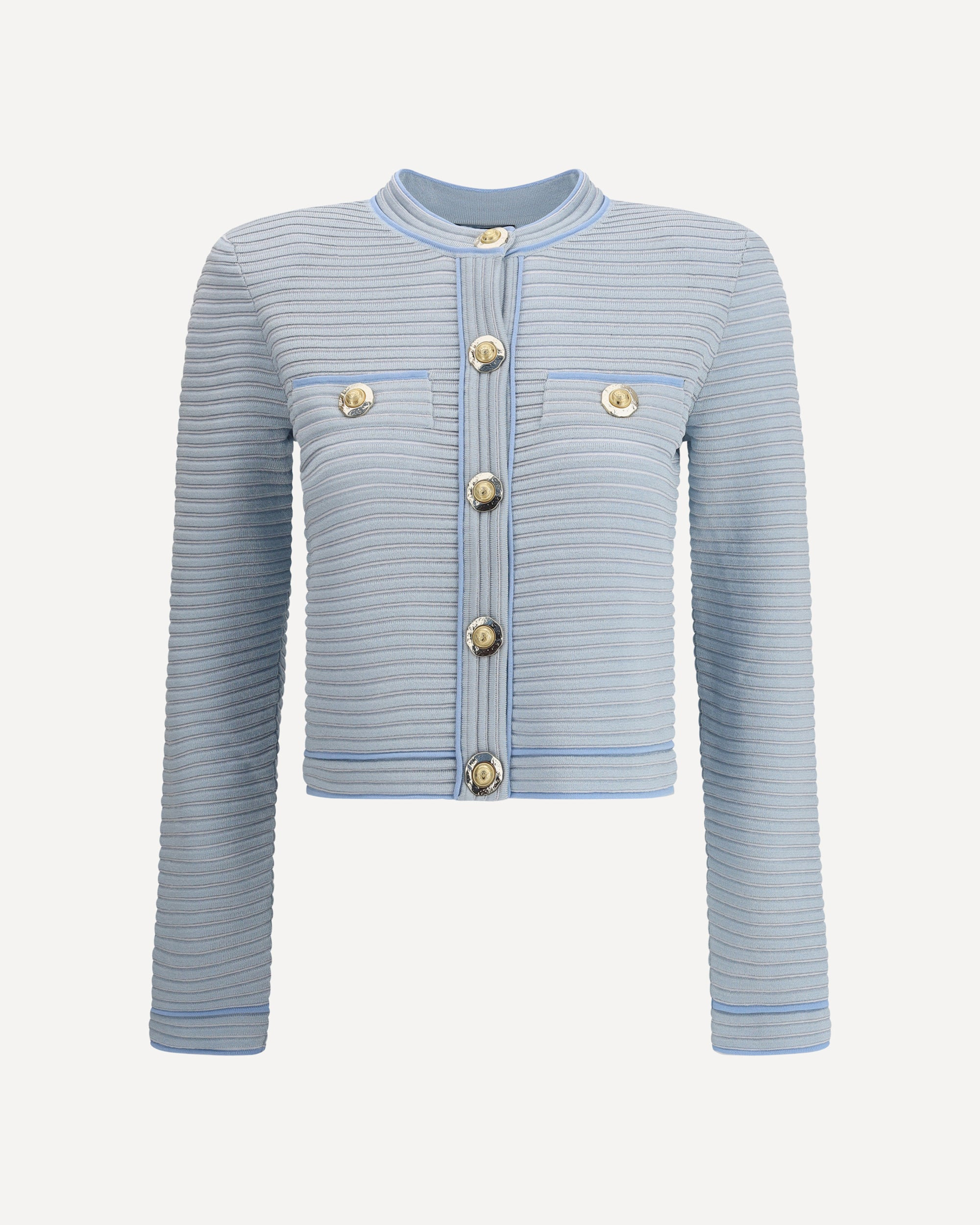 Balmain's Cardigan is a garment with a structured design and refined elegance. The front closure with five snap buttons is paired with two trompe-l'œil pockets enriched with decorative metal "Gold and Gold Coin" buttons, the house's distinctive signature. Beaded trims define the straight-fit silhouette, while structured shoulders and long sleeves lend a bold and sophisticated touch. DETAILS - Sku: FF1KL240KI83_SOM - Season: AW25 - Fit: Slim - Composition: GENERAL 82% Viscose 15% Polyester 3% Polyamide - MADE IN ITALY