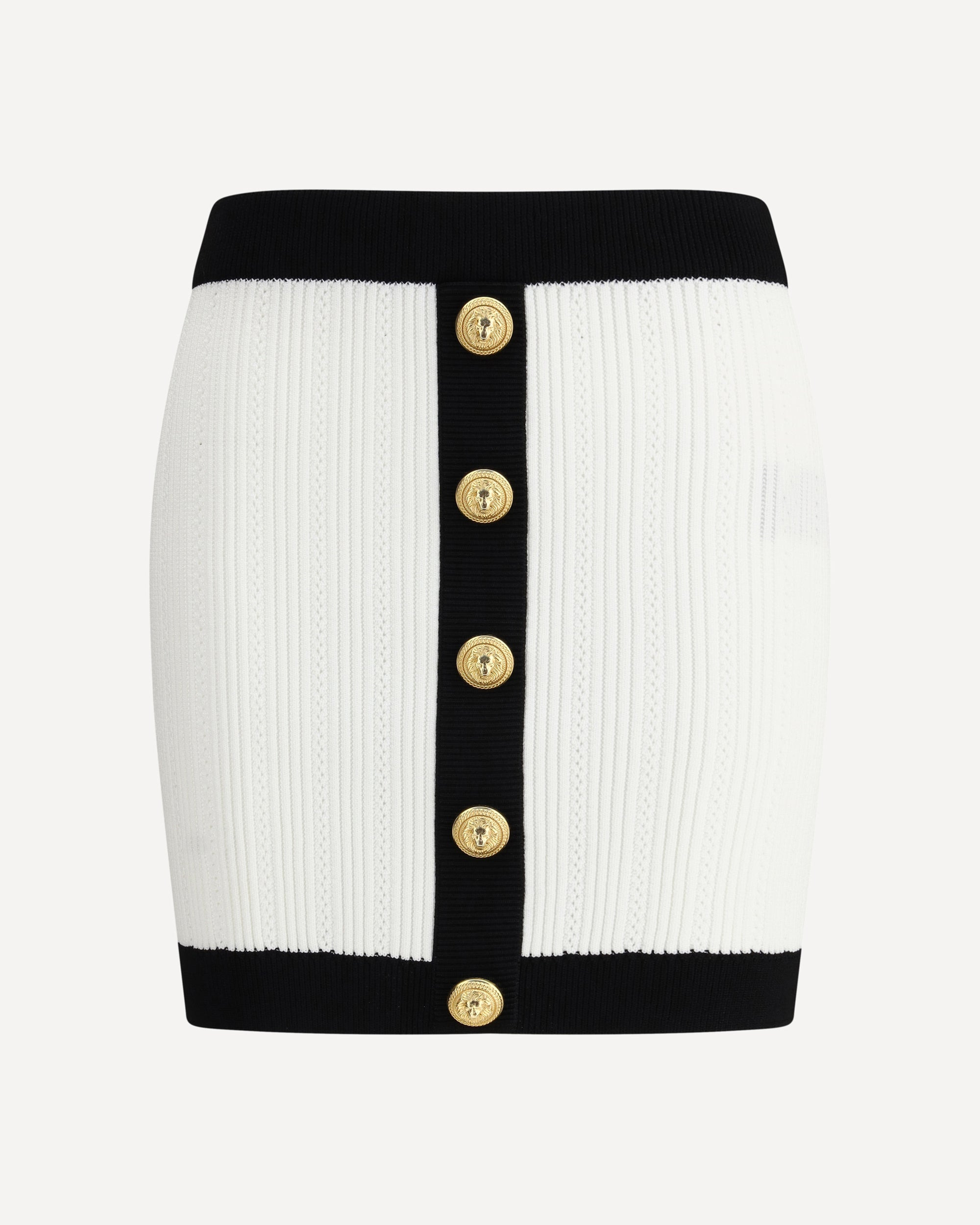 Balmain's mini Skirt enhances the silhouette with a refined ribbed knit. Decorative gold metal "Coin" buttons at the front add an iconic and distinctive touch, while contrasting ribbed trim completes the design with character and sophistication. DETAILS - Sku: FF1LB039KI64_GAB - Season: AW25 - Fit: Slim - Composition: GENERAL 84% Viscose 16% Polyester - MADE IN ITALY