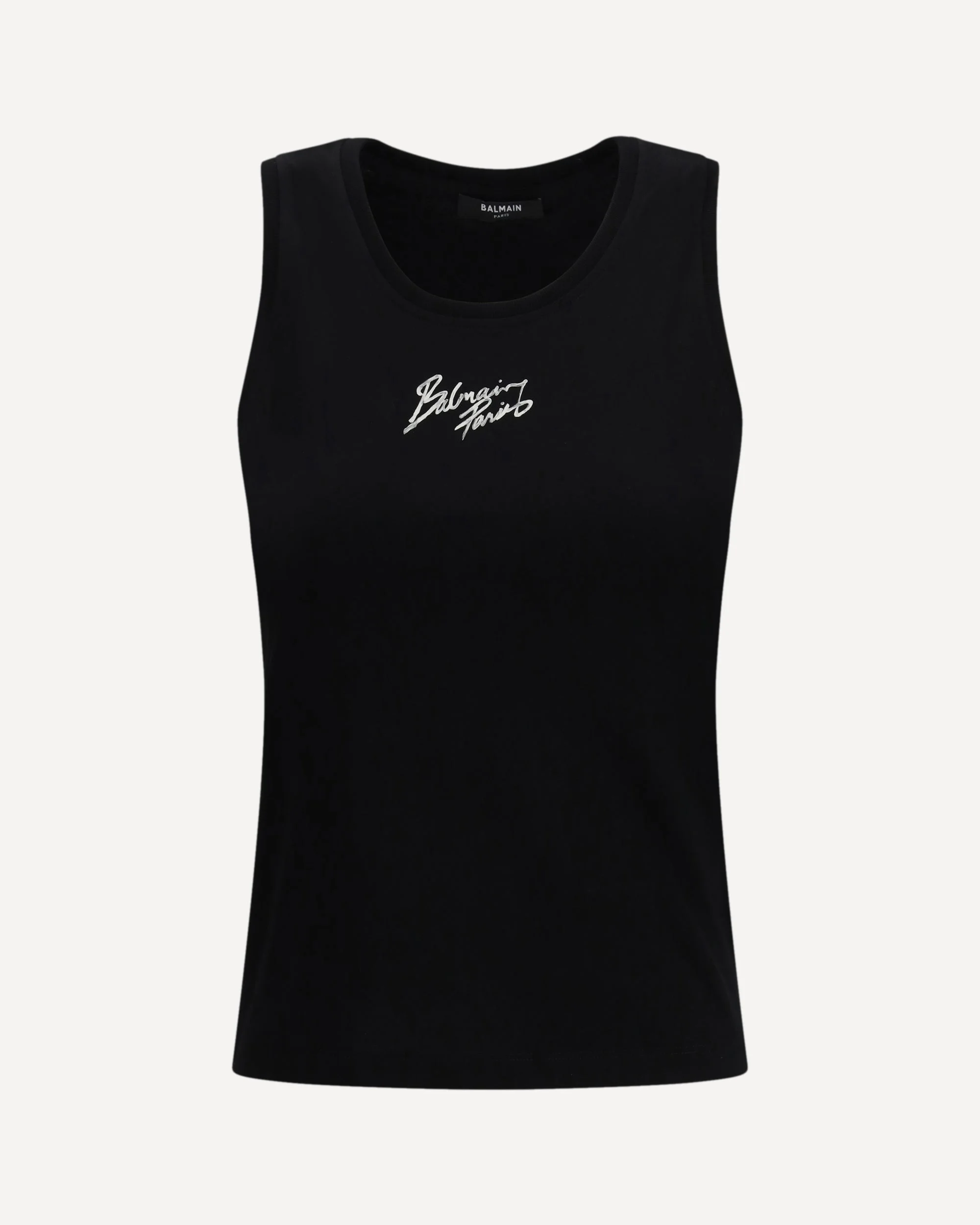 The Relaxed tank top by Balmain featuring the Balmain Paris Brush print, crafted from soft cotton jersey. The clean round neckline and ribbed edging refine the minimalist silhouette, while the relaxed fit adds a modern, effortless feel. A versatile piece that highlights the Maison’s graphic identity. DETAILS - Sku: GF1EB075BD40_EAB - Season: SS26 - Fit: Slim - Composition: GENERAL 100% Cotton - MADE IN PORTUGAL