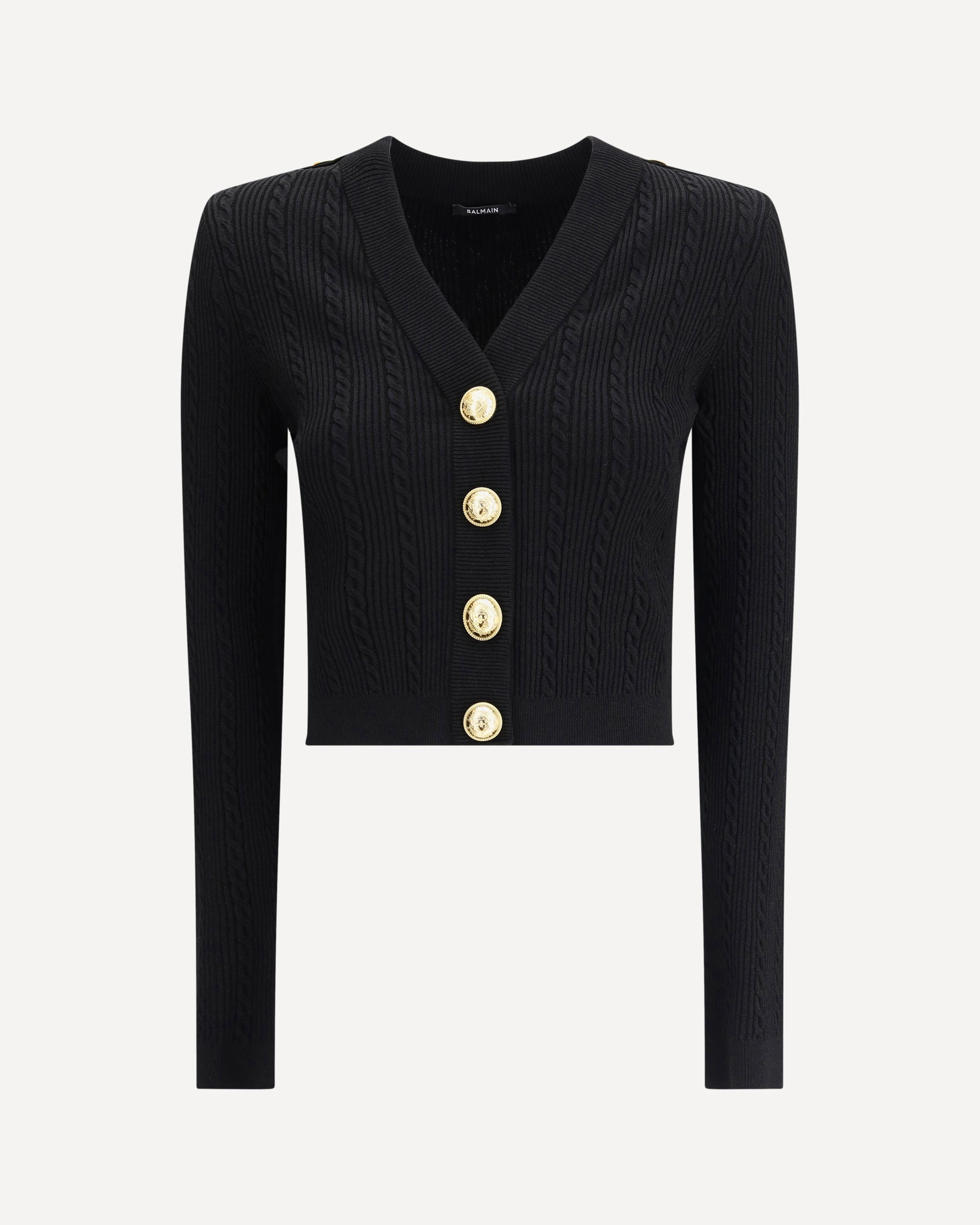 LS Buttoned V-Neck Torsade Knit Cardigan in Black
