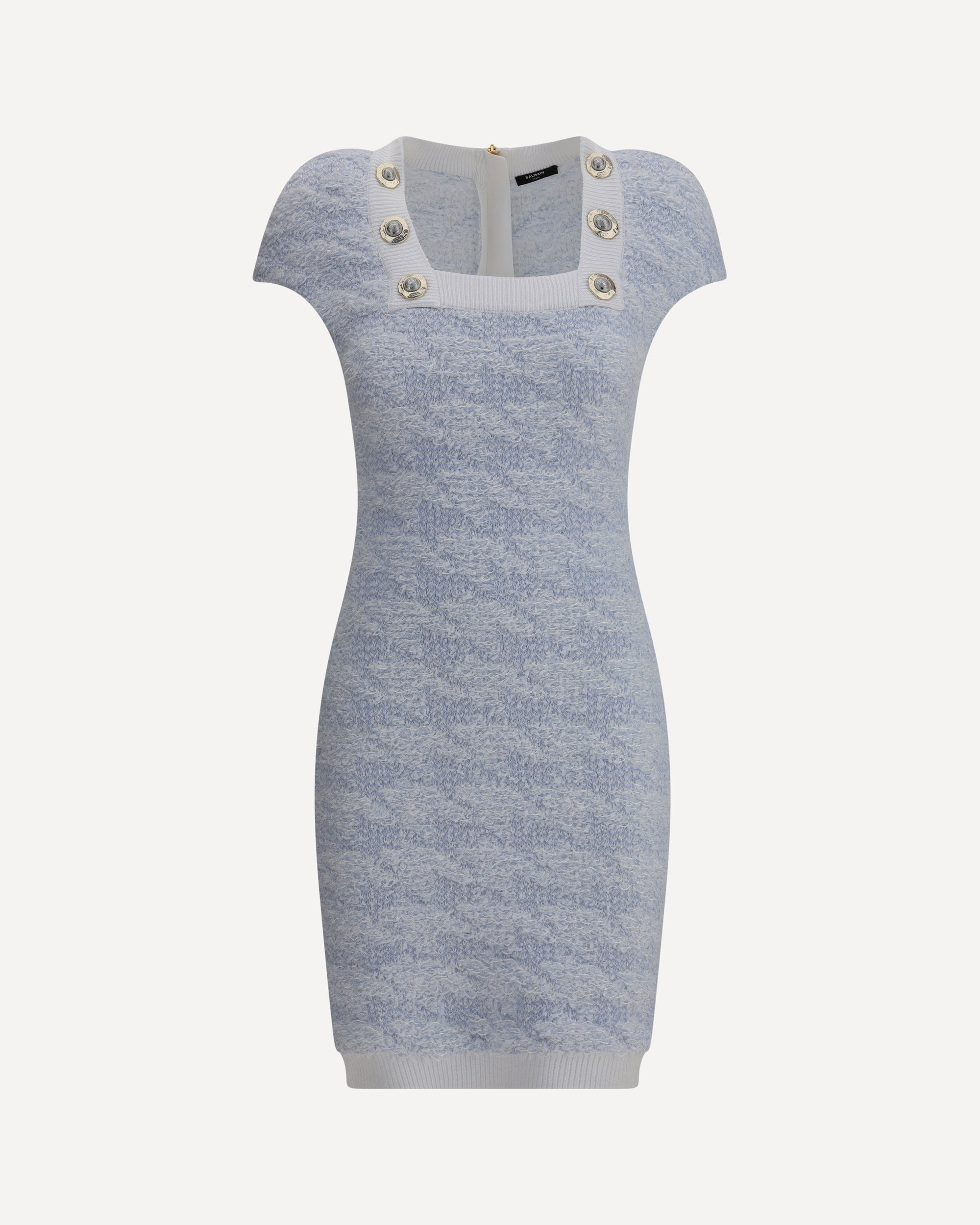 Balmain's Stretch midi Dress combines style and comfort with a fitted, modern silhouette. It features a ribbed square neckline embellished with embossed button details, short sleeves, and a back zipper closure for an elegant and refined look perfect for any occasion. DETAILS - Sku: FF1R6136KI72_SOM - Season: AW25 - Fit: Slim - Composition: GENERAL 66% Polyamide 16% Viscose 13% Cotton 5% Polyester - MADE IN FRANCE