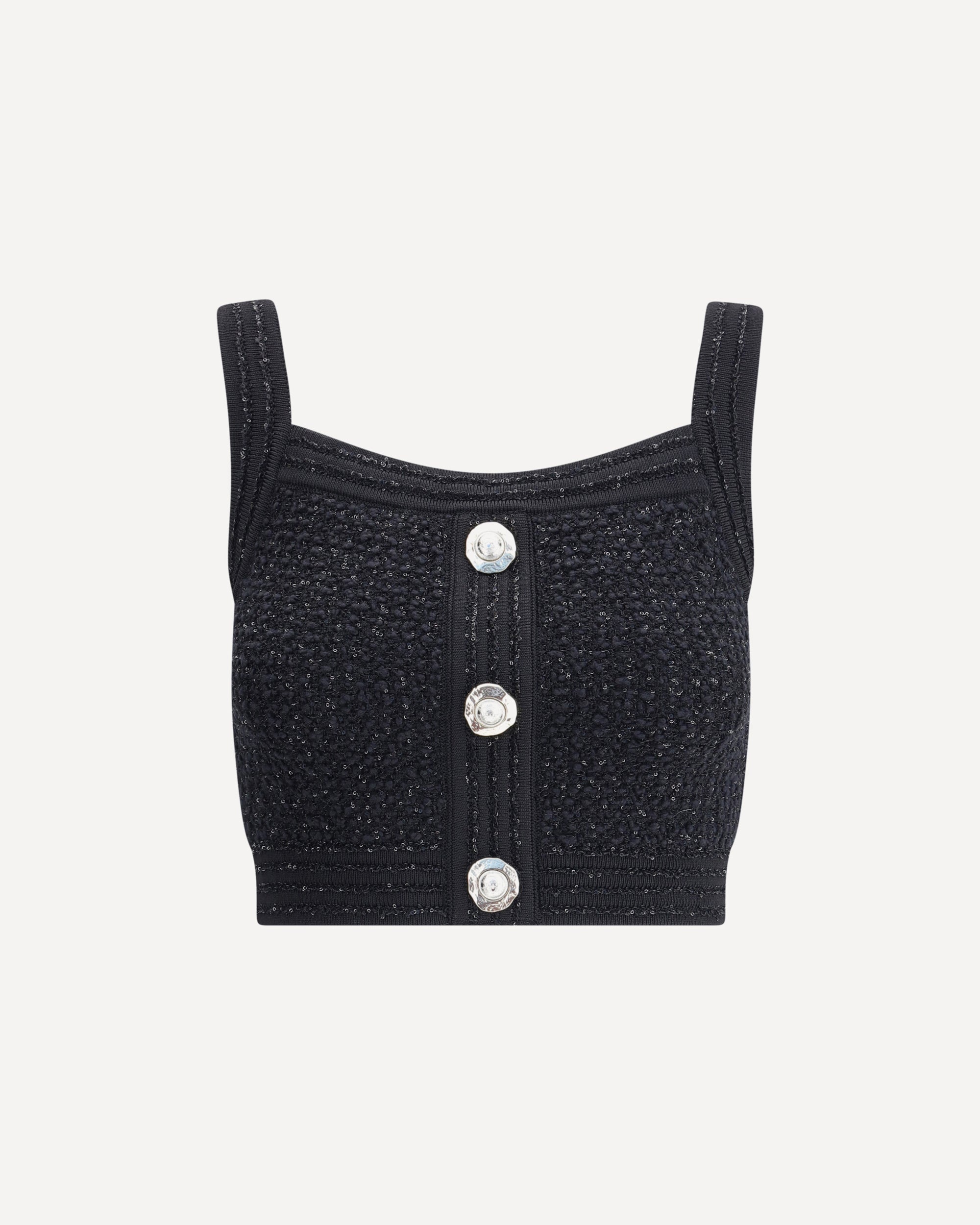 Balmain's tweed crop Top is a bold and refined piece featuring a square neckline and thick straps that enhance the silhouette. Crafted in the Maison's iconic tweed, it features a front closure with embossed buttons, a distinctive detail that adds a touch of structured elegance to the design. DETAILS - Sku: FF1AB052KI74_0PA - Season: AW25 - Fit: Slim - Composition: GENERAL 41% Polyamide 35% Viscose 23% Cotton 1% Elastane - MADE IN FRANCE
