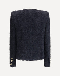 Balmain's tweed Spencer Jacket is an iconic piece, featuring a round neckline and structured shoulders that define the silhouette. The long sleeves end with straight cuffs decorated with five gold metal "Coin" buttons, while twelve decorative "Gold and Gold Coin" buttons stand out on the front, adding a touch of luxury. The raw cut finish and serge lining complete the design, combining elegance and sophistication typical of the Maison. DETAILS - Sku: FF1SM508XC67_0PA - Season: AW25 - Fit: Regular - Composition: GENERAL 100% Polyamide - MADE IN POLAND