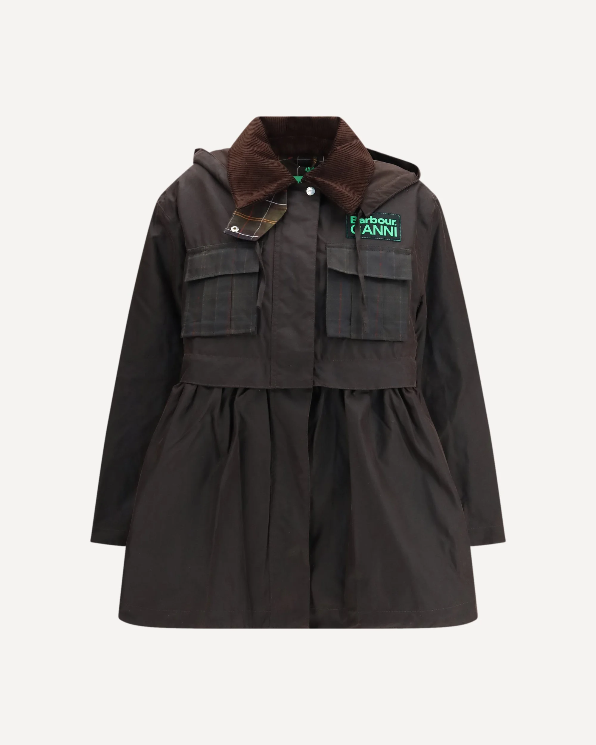 The waxed peplum Jacket by Barbour x GANNI blends British heritage with Scandinavian playfulness in a versatile, transformable design. The elongated silhouette features a detachable peplum skirt that zips off to reveal a shorter cropped shape, offering two looks in one. Barbour’s iconic waxed finish and tartan lining meet GANNI’s bold identity, highlighted by the dual-logo patch at the chest. A modern yet vintage-tinged piece, perfect for refreshing seasonal wardrobes with character and effortless style. DETAILS - Sku: LWX1523_BR71 - Season: SS26 - Fit: Regular - Composition: OUTER 100% Cotton INNER 35% Cotton 65% Polyester - MADE IN MOLDOVA