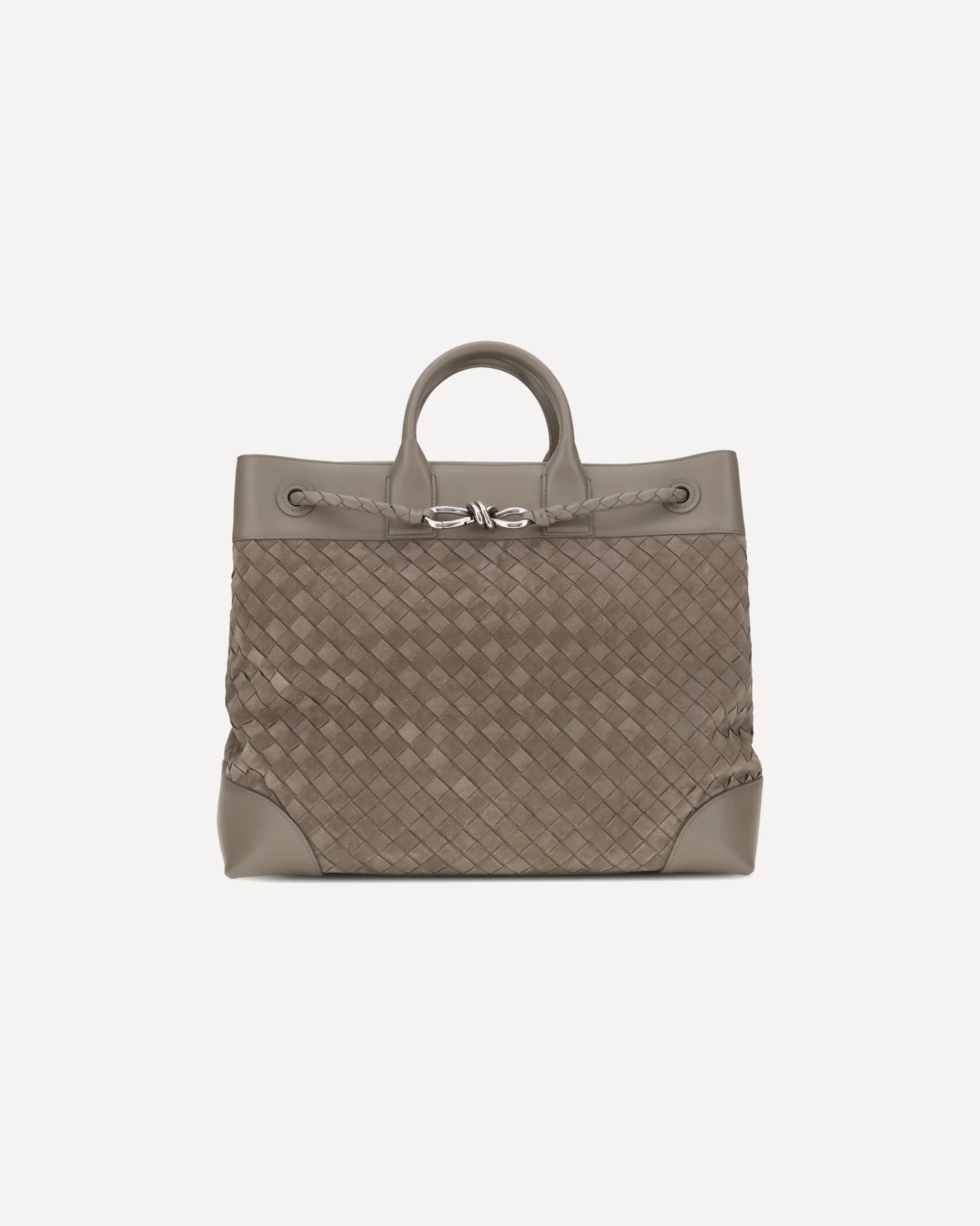 The Andiamo Travel Bag by Bottega Veneta embodies the brand's excellent craftsmanship, combining smooth leather and soft suede in an elegant Intrecciato pattern. Embellished with the emblematic Knot detail, the distinctive symbol of the maison, it features an adjustable and removable cross-body strap that enhances its versatility. A sophisticated accessory designed to accompany every move in style. DETAILS - Sku: 827066V1QE5_2818 - Season: AW25 - Dimension: 43x43x20 - Composition: GENERAL 100% Calf Leather Bos Taurus - MADE IN ITALY