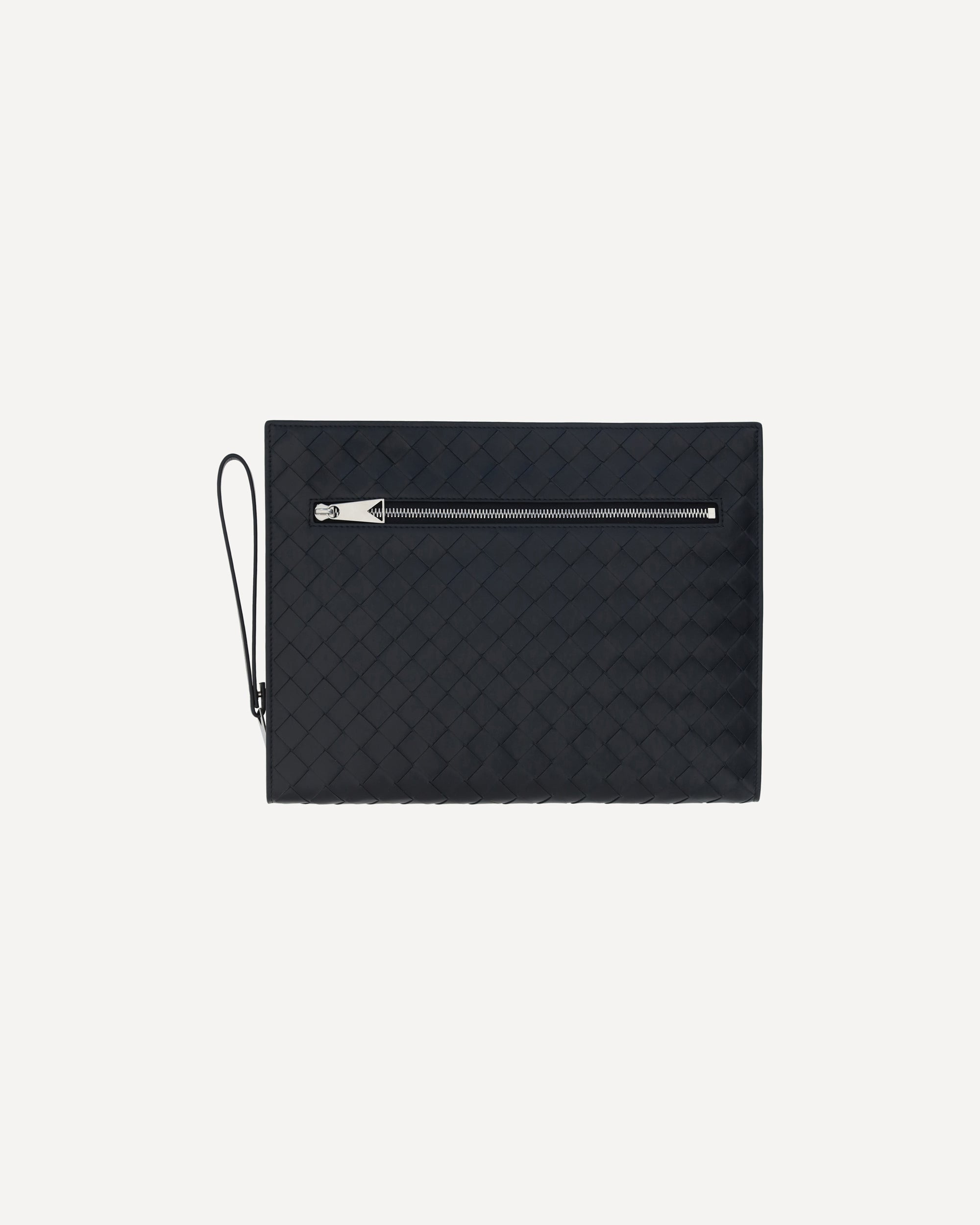 Calfskin Avenue Pouch Bag by Bottega Veneta, top zipper closure, iconic all-over repeated brand woven design, side leather pull for carrying it by hand, zippered slit pocket on back. DETAILS sku 732638V2E41_8803 composition : CALF LEATHER BOS TAURUS 100% color group : BLACK gender : MAN season : AW23 size chart : MAN UNI category name : CLUTCHES icon : icon dimensions :