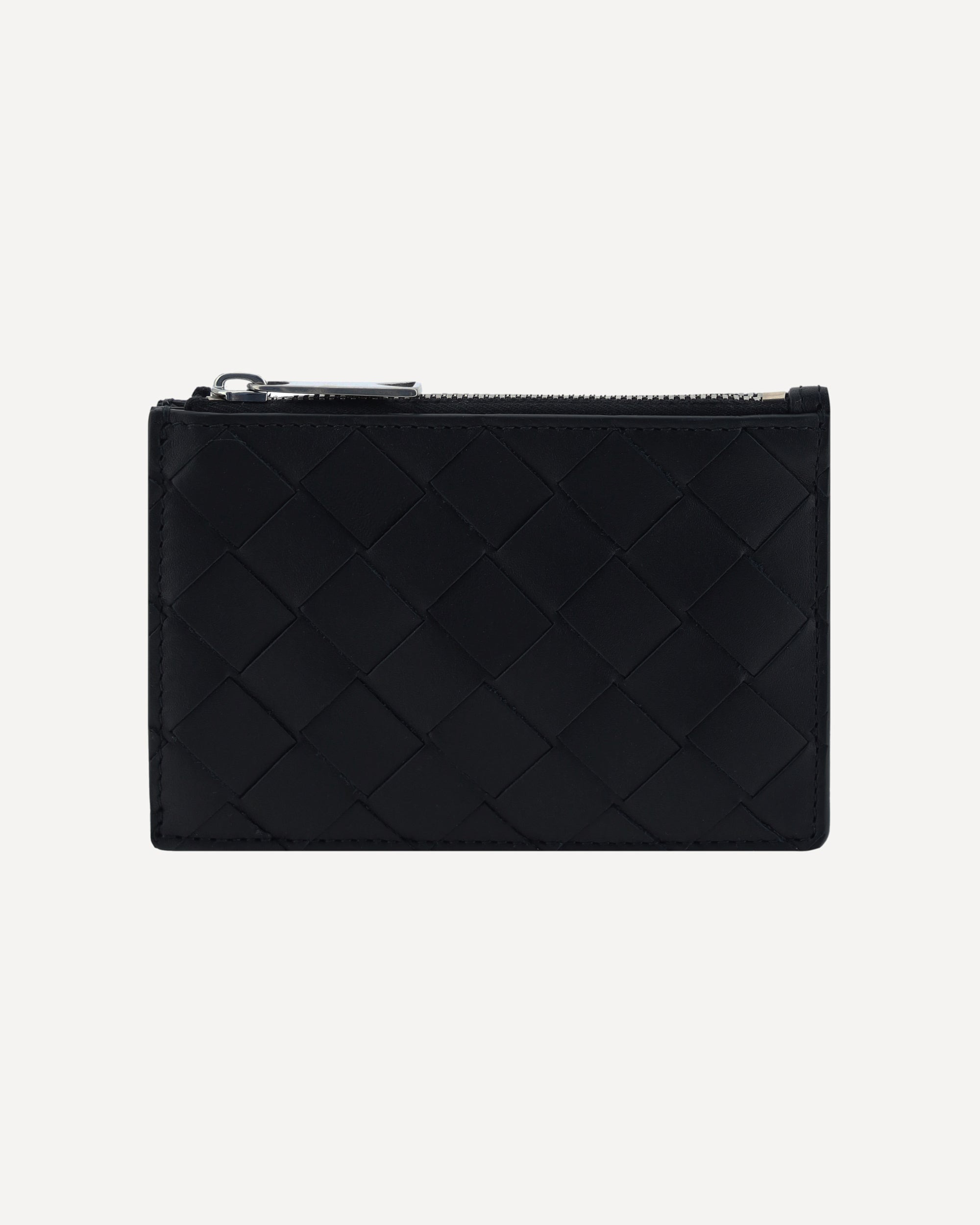 Calfskin Card Holder by Bottega Veneta, card slots on back, iconic brand intrecciato design on front, top zipper closure. DETAILS sku 749439VCPQ3_8803 composition: CALF LEATHER BOS TAURUS 100% color group: BLACK gender: MAN season: AW24 size chart: UNI category name: KEY RINGS icon: icon dimensions: 12 x 14 cm