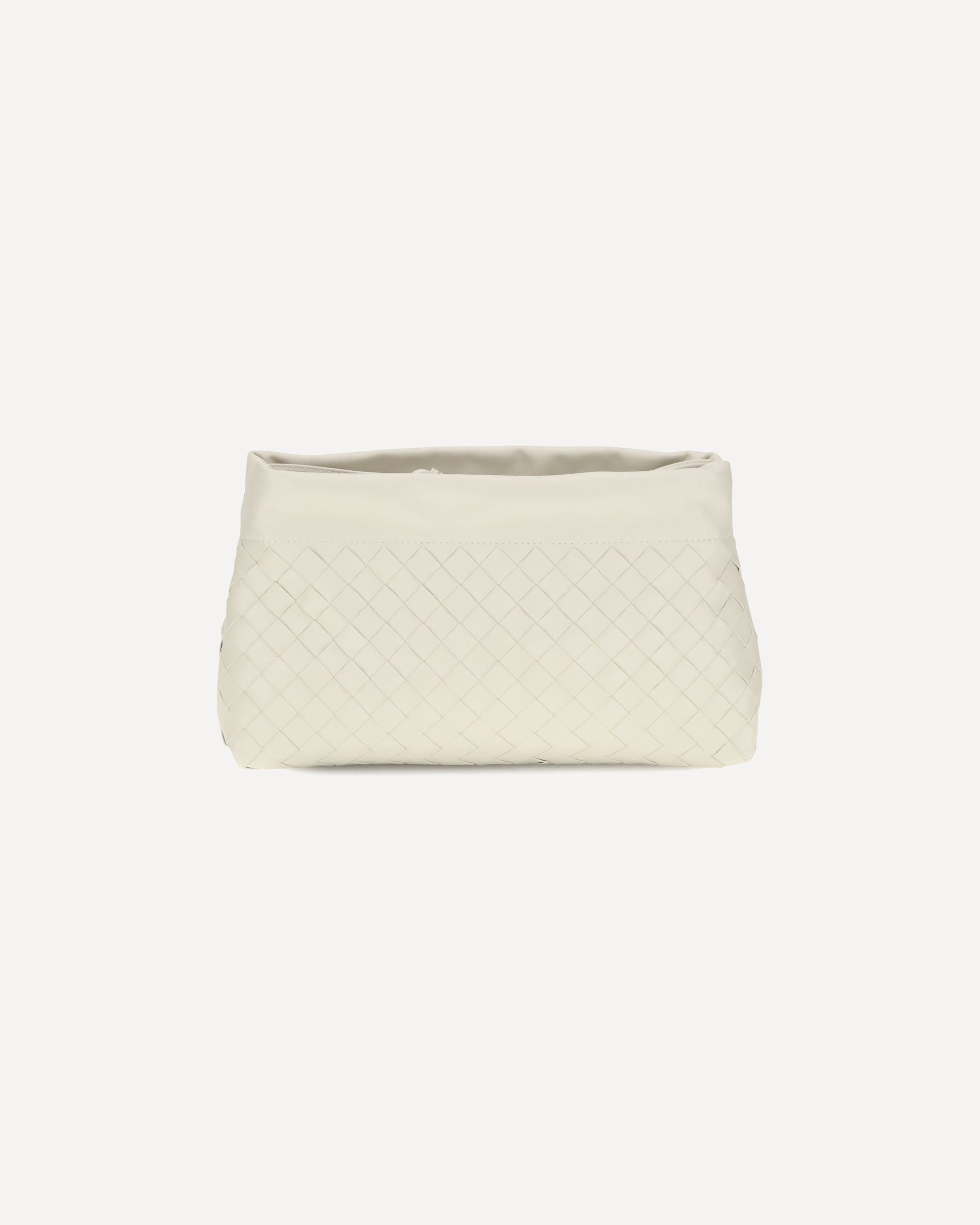 Bottega Veneta's leather Drawstring Pouch combines elegance and craftsmanship. Made of soft leather with the emblematic woven work, it features a curly drawstring closure and removable chain strap with leather woven details. The interior, with a single compartment, is perfect for essentials. Compact and versatile, it is the ideal accessory to complete any look in style. DETAILS - Sku: 839394V3IV0_9195 - Season: AW25 - Dimension: 33x33x8 - Composition: GENERAL 100% Calf Leather Bos Taurus - MADE IN ITALY