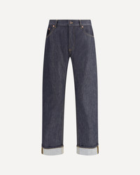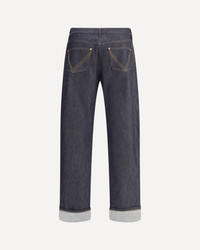 Bottega Veneta's Indigo Rinsed wide leg Jeans express relaxed elegance through soft lines and refined details. Made of lightweight denim subjected to a delicate indigo wash, they feature turn-ups at the bottom and are embellished with a suede patch with the iconic Intrecciato pattern applied to the back. An essential garment with a sophisticated and contemporary style. DETAILS - Sku: 831605V5MG0_4245 - Season: AW25 - Fit: Regular - Composition: GENERAL 100% Cotton - MADE IN ITALY
