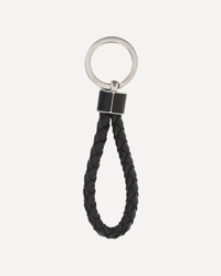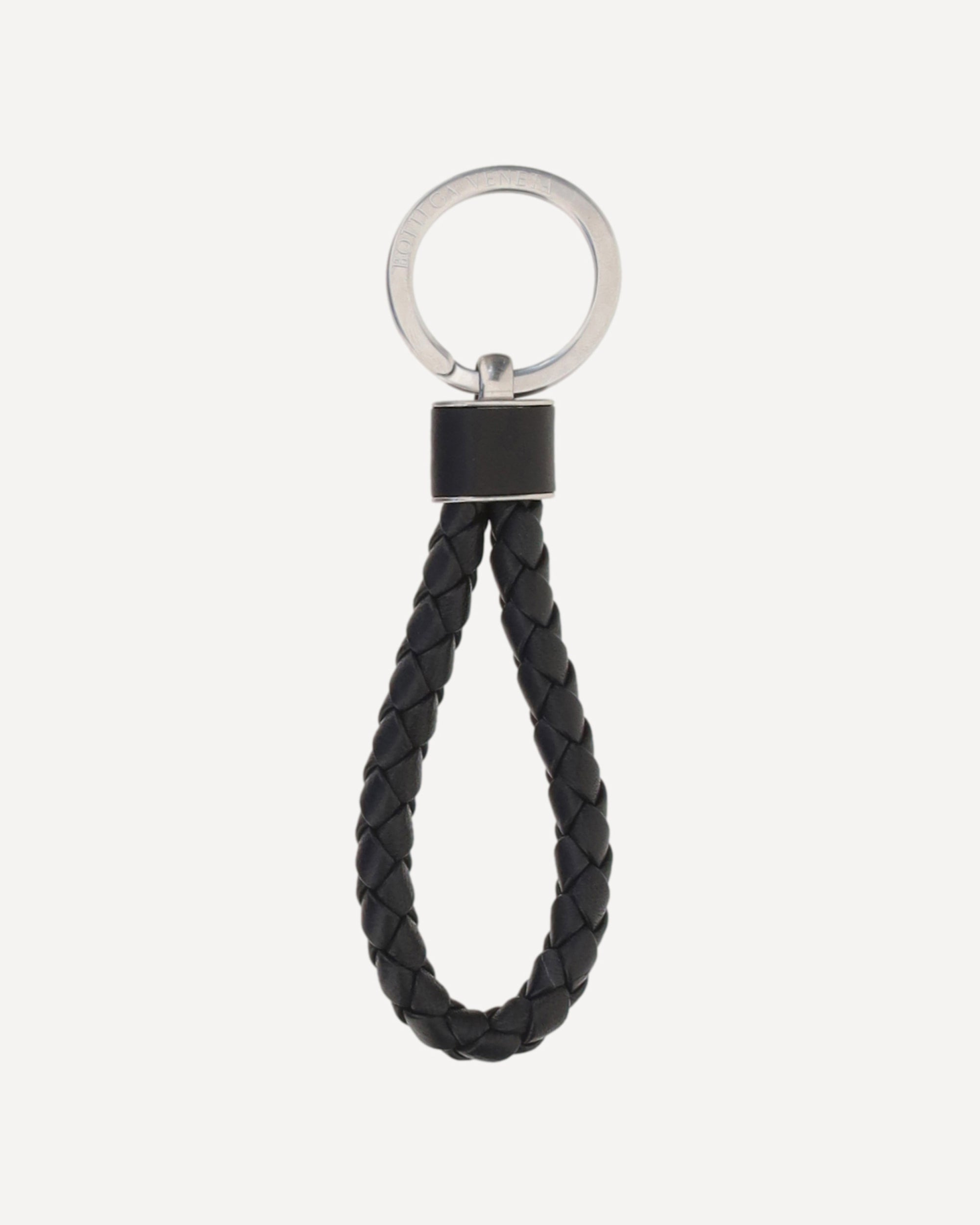 Calfskin Key Ring by Bottega Veneta, metal key ring, pendant with iconic braided design. DETAILS sku 709727VMAY1_8803 composition : LAMB OVIS ARIES ARIES 100% color group : BLACK gender : MAN season : AW23 size chart : MAN UNI category name : KEY RINGS icon : icon dimensions :