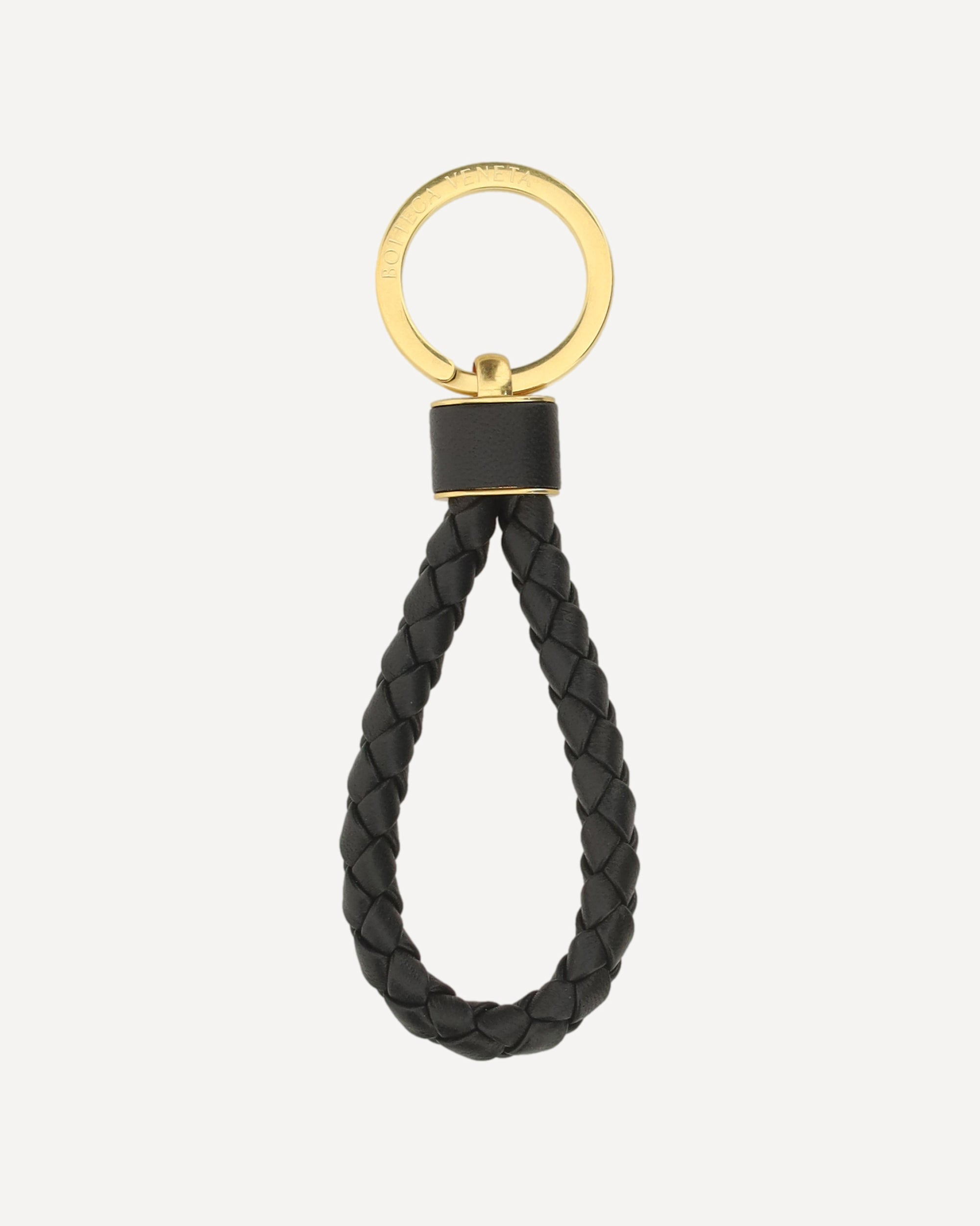 Lambskin Key Ring by Bottega Veneta, braided puller, gold-plated metallic ring, engraved brand signature. DETAILS sku 651820V0HW1_8425 composition : LAMB OVIS ARIES ARIES 100% color group : BLACK gender : WOMAN season : AW23 size chart : WOMAN UNI category name : KEYRINGS e CHAINS icon : icon