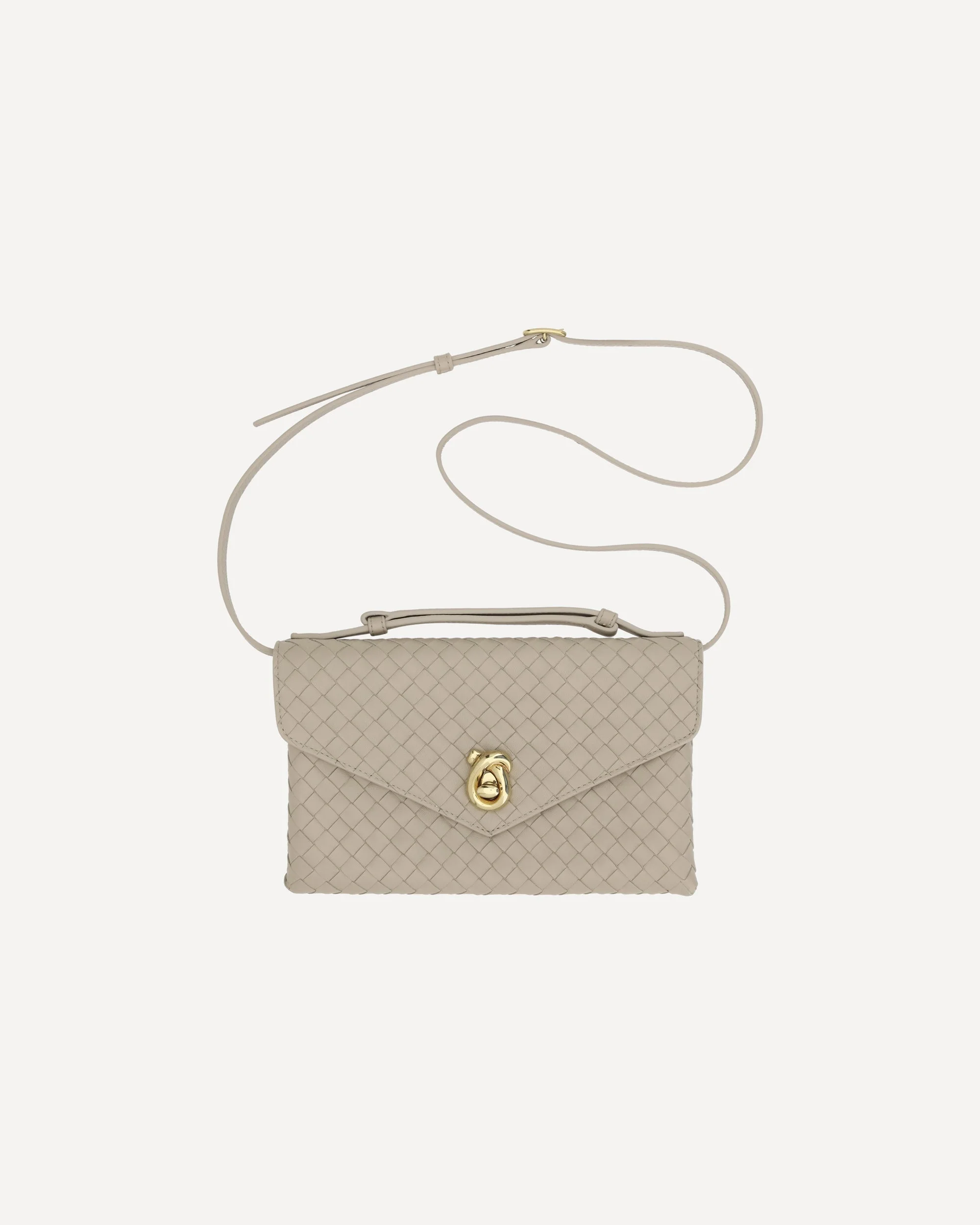 Bottega Veneta's Knot Lock Shoulder Bag is made of lambskin leather, with a sophisticated design and the brand's iconic woven pattern. It features a flat top handle, an adjustable and removable shoulder strap for different wearing options. The closure features the iconic Knot Lock on the front, while on the back you find a slit pocket. Inside, the bag offers two compartments and a card slot, combining elegance and functionality in one accessory. DETAILS sku 817191V08Z0_9614 composition: LAMB OVIS ARIES ARIES 100% color group: BEIGE gender: WOMAN season: SS25 size chart: UNI category name: SHOULDER BAGS icon: icon dimensions: 16 x 25 x 5.5 cm