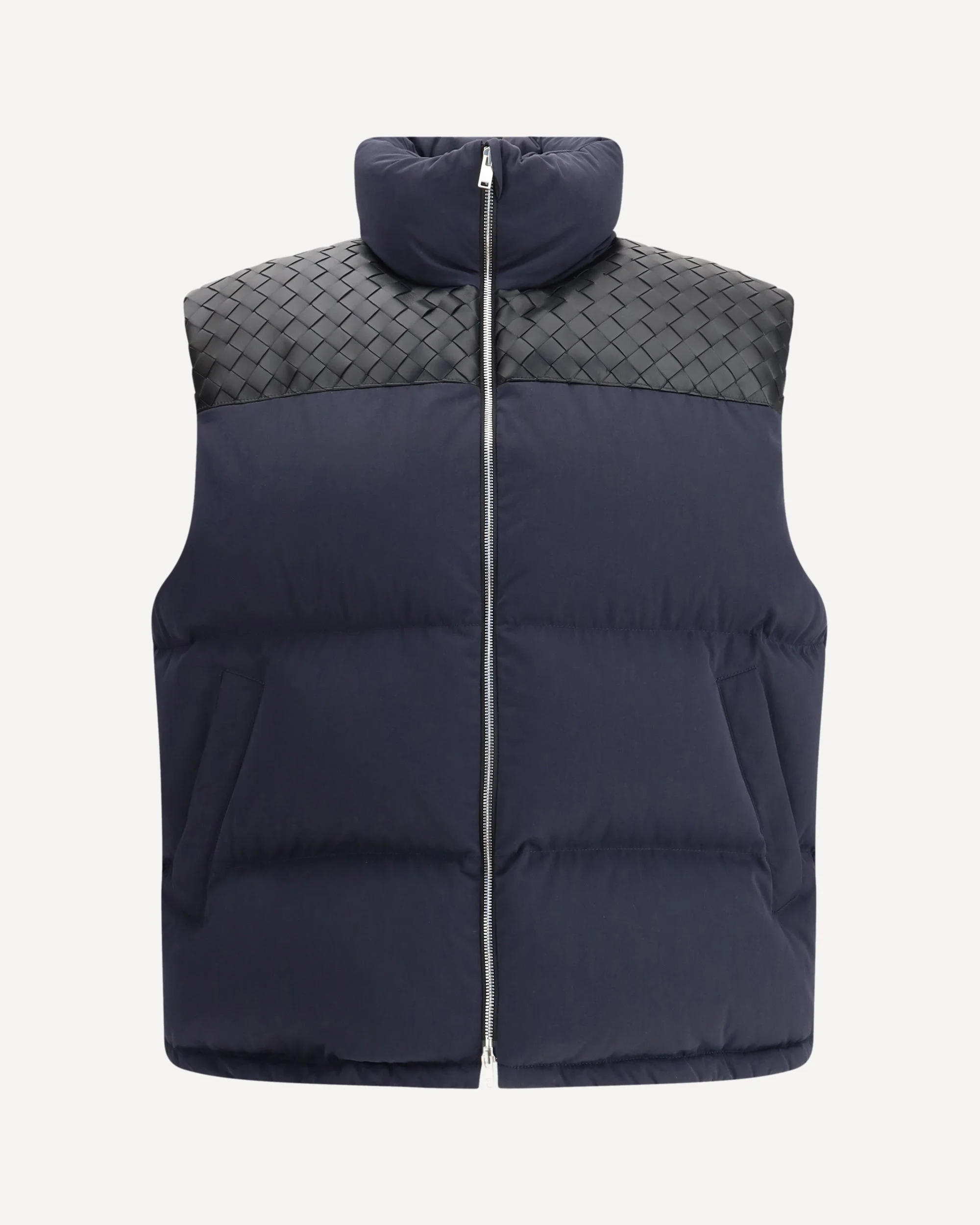The padded Gilet in organic Satin Poplin by Bottega Veneta blends understated elegance with refined detail. Lightly filled with down, it is enriched by a leather insert featuring the iconic Intrecciato motif. A zip fastening and contrasting lining enhance its modern, functional spirit, while the exclusive internal tag speaks to the Maison’s craftsmanship. A versatile and sophisticated piece, ideal for transitional dressing with a contemporary edge. DETAILS - Sku: 837050V5O60_4246 - Season: AW25 - Fit: Regular - Composition: GENERAL 100% Cotton - MADE IN ITALY