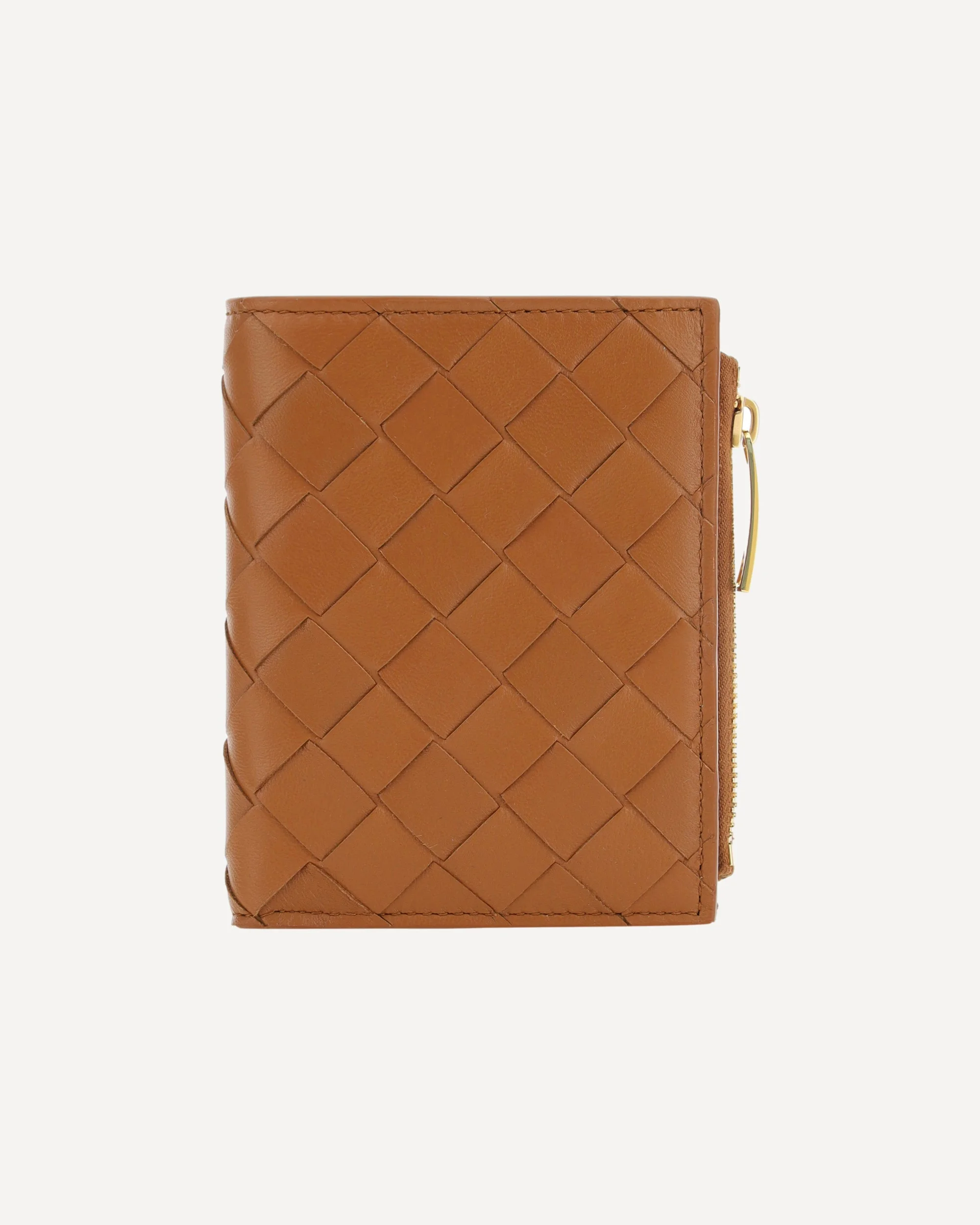 Lambskin Wallet by Bottega Veneta, iconic brand's woven design repeated all-over, double card slots inside, snap button closure, zippered coin compartment for closure, bill compartment, iconic brand monogram press-stamped inside. DETAILS sku 742330VCPP3_2650 composition : LAMB OVIS ARIES ARIES 100% color group : BROWN gender : WOMAN season : AW23 size chart : WOMAN UNI category name : SHOULDER BAGS icon : icon dimensions : height 9 cm length 11,5 cm depth 2,5 cm