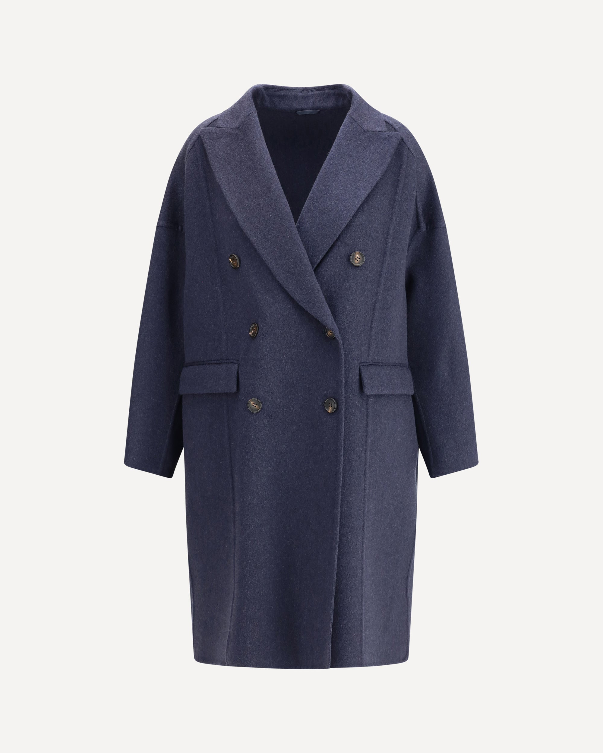 Brunello Cucinelli's cashmere Coat expresses elegance and quality craftsmanship in every detail. Featuring a wide peaked lapel and a double-breasted closure with contrasting buttons, it has two welt flap pockets applied on the front. The monochrome design, over-fit and mid-length make it a sophisticated and versatile garment, perfect for completing refined looks in the cold season. DETAILS - Sku: MD5039677_C7186 - Season: AW25 - Fit: Regular - Composition: GENERAL 100% Kashmir/capra Hircus - MADE IN ITALY